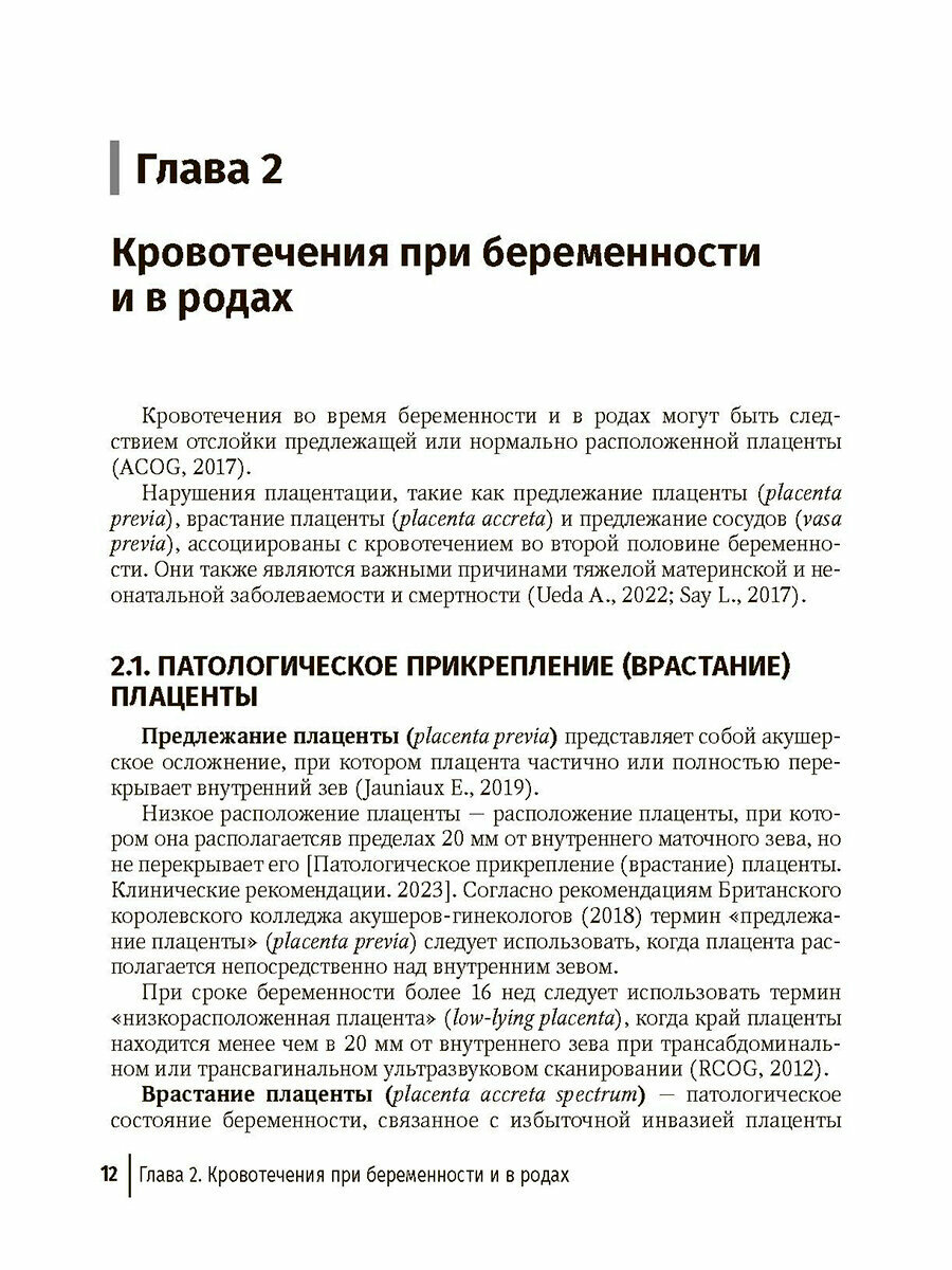 Акушерские кровотечения остаются одной из основных причин материнской заболеваемости и смертности во всех странах мира. Имеются различия в распространенности акушерских кровотечений и связанной с ними смертности в разных странах мира, а также подходах к их управлению. В руководстве проведен анализ клинических рекомендаций различных профессиональных медицинских сообществ (ВОЗ, FIGO, ACOG, RCOG, SCOG, РОАГ) и клинических исследований по проблеме акушерских кровотечений. Изложены современные сведения, касающиеся основных причин, эпидемиологии, классификации кровотечений при беременности, в родах и послеродовом периоде. Даны представления о клинических проявлениях, подходах к диагностике и лечению акушерских кровотечений. Приведены алгоритмы действий медицинского персонала при акушерских кровотечениях, а также возможности профилактики и реабилитации этих пациенток. Издание предназначено акушерам-гинекологам, клиническим ординаторам, обучающимся по специальности "Акушерство и гинекология", а также может быть полезно для анестезиологов-реаниматологов, работающих в акушерской практике, врачей общей практики, студентов медицинских вузов, руководителей и главных специалистов по акушерству и гинекологии региональных органов управления здравоохранением, преподавателей медицинских колледжей по специальности "Акушерство и гинекология".