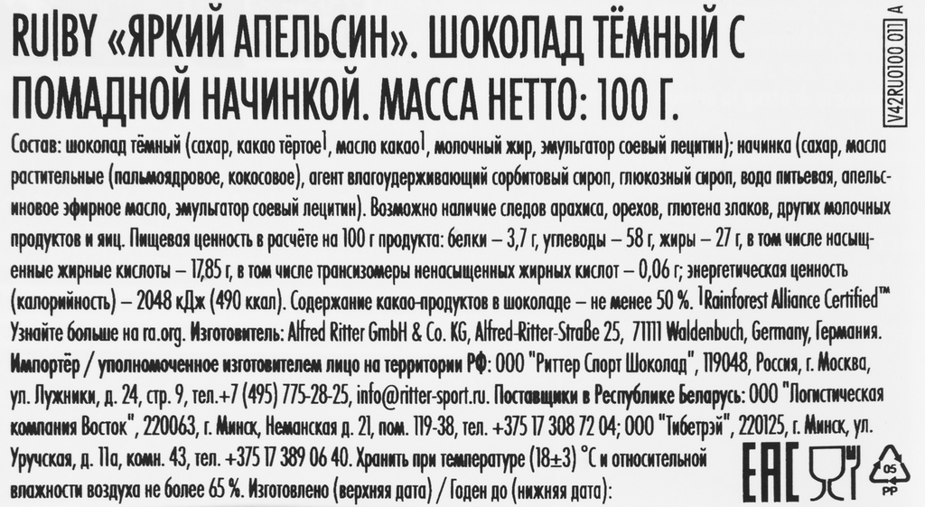| Состав | шоколад темный (сахар, какао тертое1, масло какао1, молочный жир, эмульгатор соевый лецитин), начинка (сахар, масла растительные (пальмоядровое, кокосовое), агент влагоудерживающий сорбитовый сироп, глюкозный сироп, вода питьевая, апельсиновое эфирное масло, эмульгатор соевый лецитин). |
