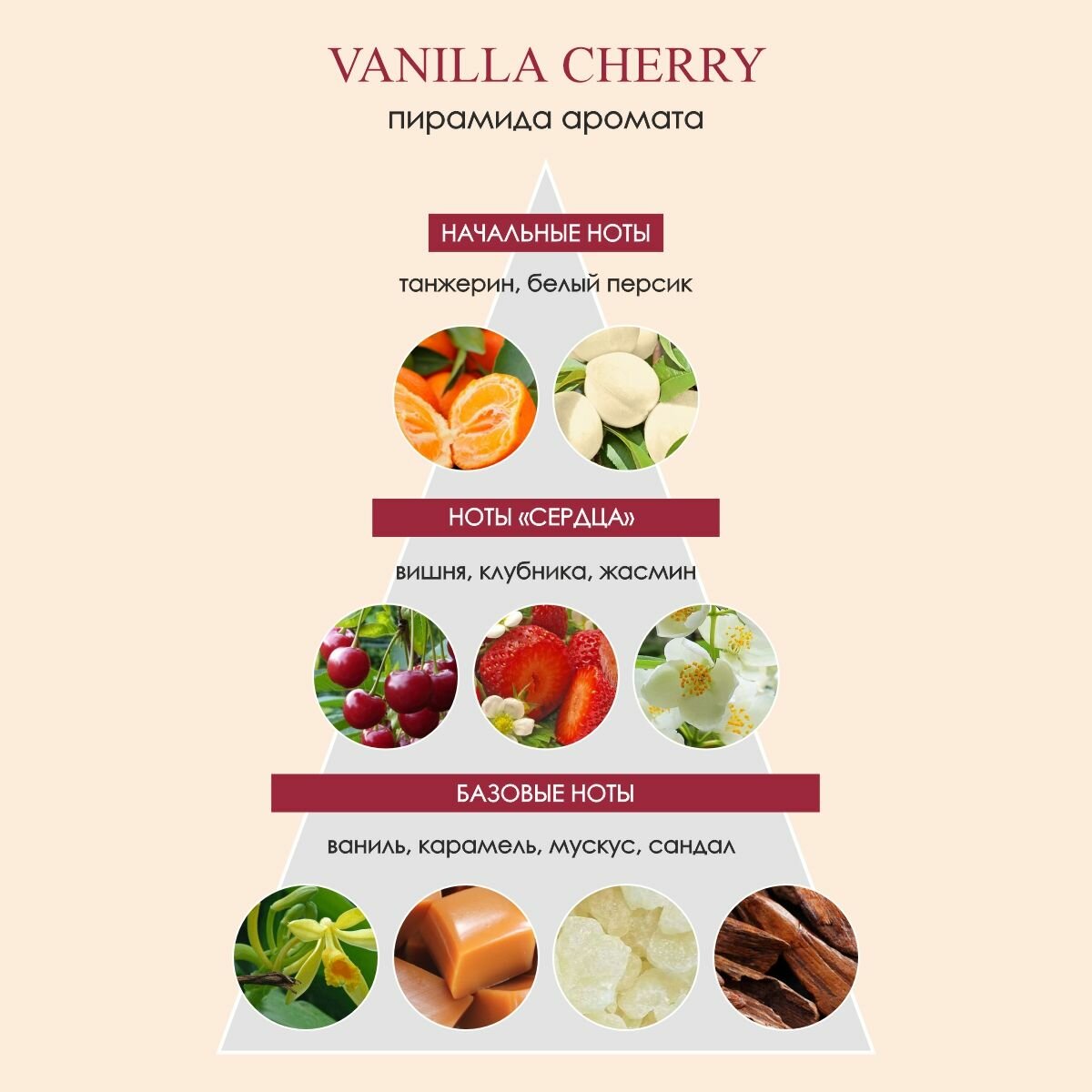 Любительницам сладкой парфюмерной вишни Vanilla Cherry точно придется по вкусу! Стартует композиция с деликатной цитрусовой ноты и спелого белого персика. Роскошное "сердце" - наслаждение для истинного гурмана! Главная нота парфюмерной композиции - спелая вишня - сплетается в своем звучании с вкусной ягодной темой клубники. Душистый жасмин вплетает цветочную мелодию, делая аромат многогранным и завораживающим. Шлейф остается на коже сладко-древесным аккордом. КЛАССИФИКАЦИЯ АРОМАТА: фруктовые, гурманные НАЧАЛЬНЫЕ НОТЫ: танжерин, белый персик НОТЫ "СЕРДЦА": вишня, клубника, жасмин БАЗОВЫЕ НОТЫ: ваниль, карамель, мускус, сандал.