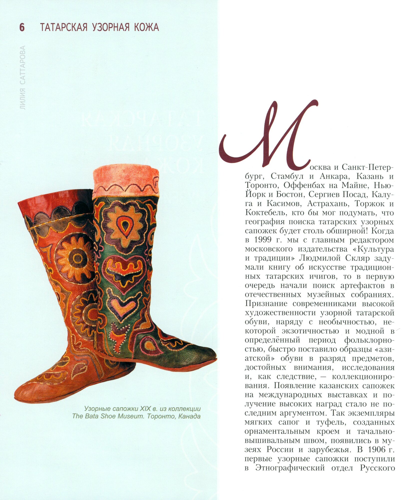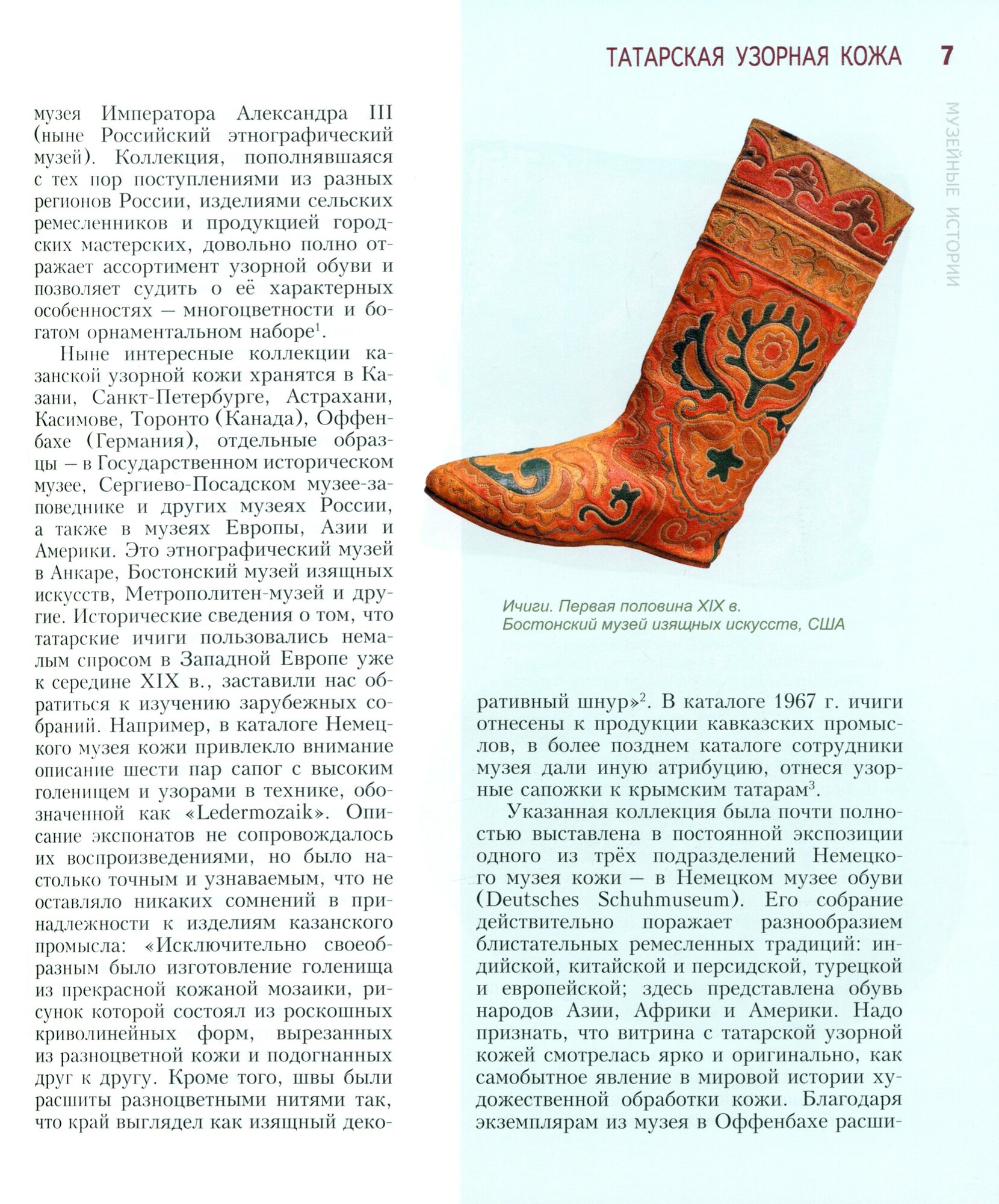 Искусство татарской узорной кожи представляет собой уникальное художественное явление. В книге показана его историческая связь с традицией изготовления кожаной обуви казанскими татарами и их предками - волжскими булгарами. Очерк об этапах развития знаменитого промысла по производству «азиатской обуви» проиллюстрирован образцами XVIII-XX столетий из многих музеев России и зарубежных стран (Турции, Германии, Канады и др.). Большое внимание уделено творчеству современных мастеров и профессиональных художников, особенностям преломления национального наследия, введению его в современный художественный контекст. Написанная ярким и доступным языком книга содержит более 160 иллюстраций, она дополнена описанием и схемами процесса «татарского шва». Все это делает настоящее издание настольной книгой исследователей, историков культуры и искусства, а также необходимым пособием для студентов художественных специальностей и всех тех, кто интересуется кожаной мозаикой и хочет освоить ее азы.