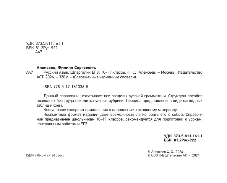 Русский язык. Шпаргалки ЕГЭ. 10-11 классы (Ф. С. Алексеев); Издательство АСТ, 2024