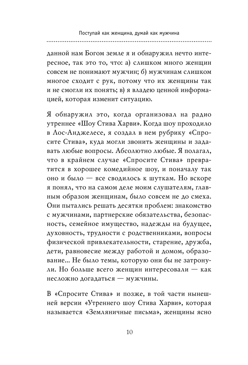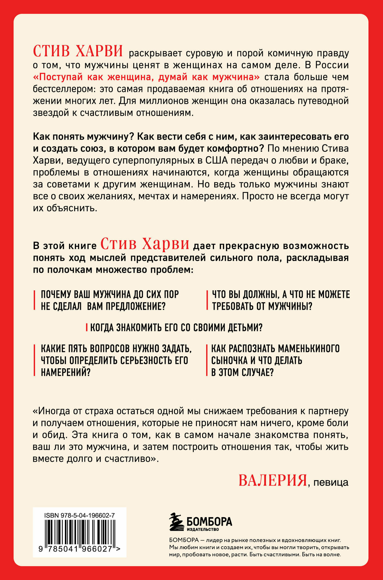 Стив Харви раскрывает суровую и порой комичную правду о том, что мужчины ценят в женщинах на самом деле. В России “Поступай как женщина, думай как мужчина” стала больше, чем бестселлером: это самая продаваемая книга об отношениях на протяжении многих лет. Для миллионов женщин эта книга оказалась путеводной звездой к счастливым отношениям. Как понять мужчину? Как вести себя с ним, как заинтересовать его и создать союз, в котором вам будет комфортно? По мнению Стива Харви, ведущего суперпопулярных в США передач о любви и браке, проблемы в отношениях начинаются, когда женщины обращаются за советами к другим женщинам. Но ведь только мужчины знают все о своих желаниях, мечтах и намерениях. Просто не всегда могут их объяснить. В этой книге Стив Харви дает прекрасную возможность понять ход мыслей представителей сильного пола.