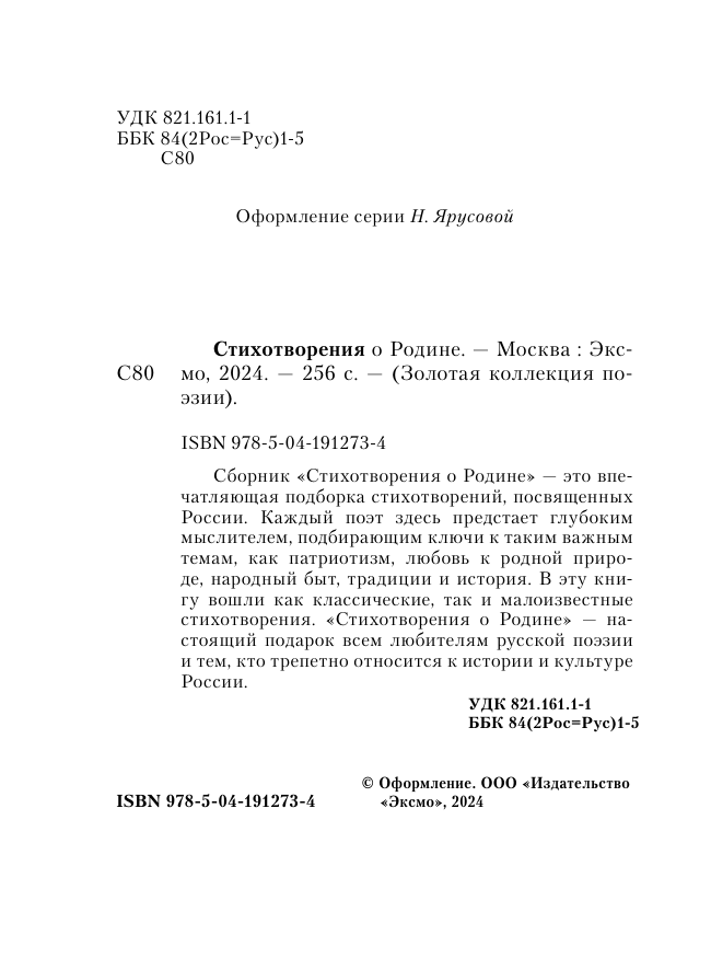 Сборник «Стихотворения о Родине» — это впечатляющая подборка стихотворений, посвященных России. Каждый поэт здесь предстает глубоким мыслителем, подбирающим ключи к таким важным темам, как патриотизм, любовь к родной природе, народному быту, традициям и истории. В эту книгу вошли как классические, так и малоизвестные стихотворения. «Стихотворения о Родине» — настоящий подарок всем любителям русской поэзии и тем, кто трепетно относится к истории и культуре России.