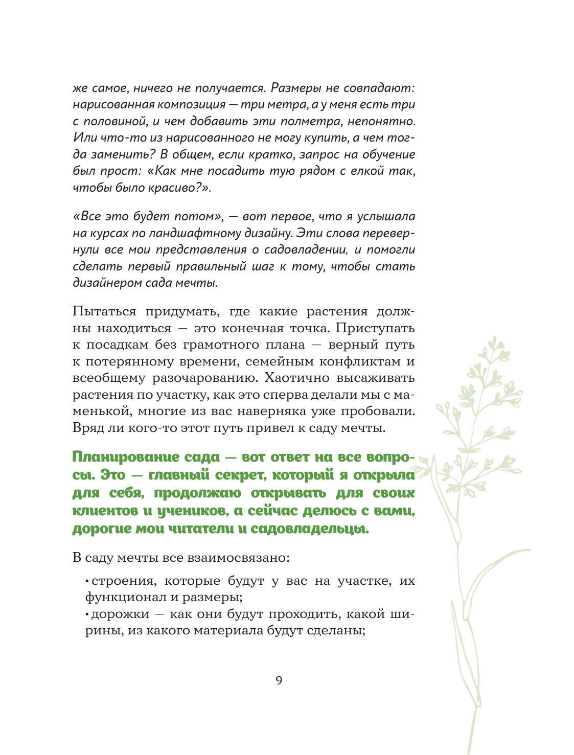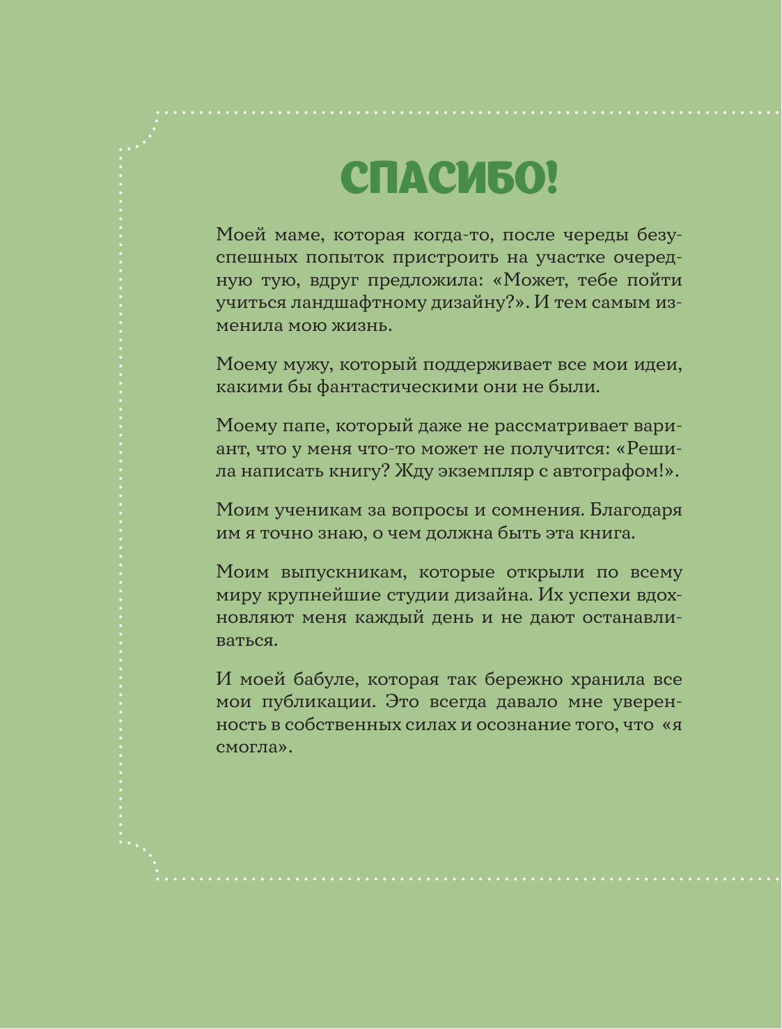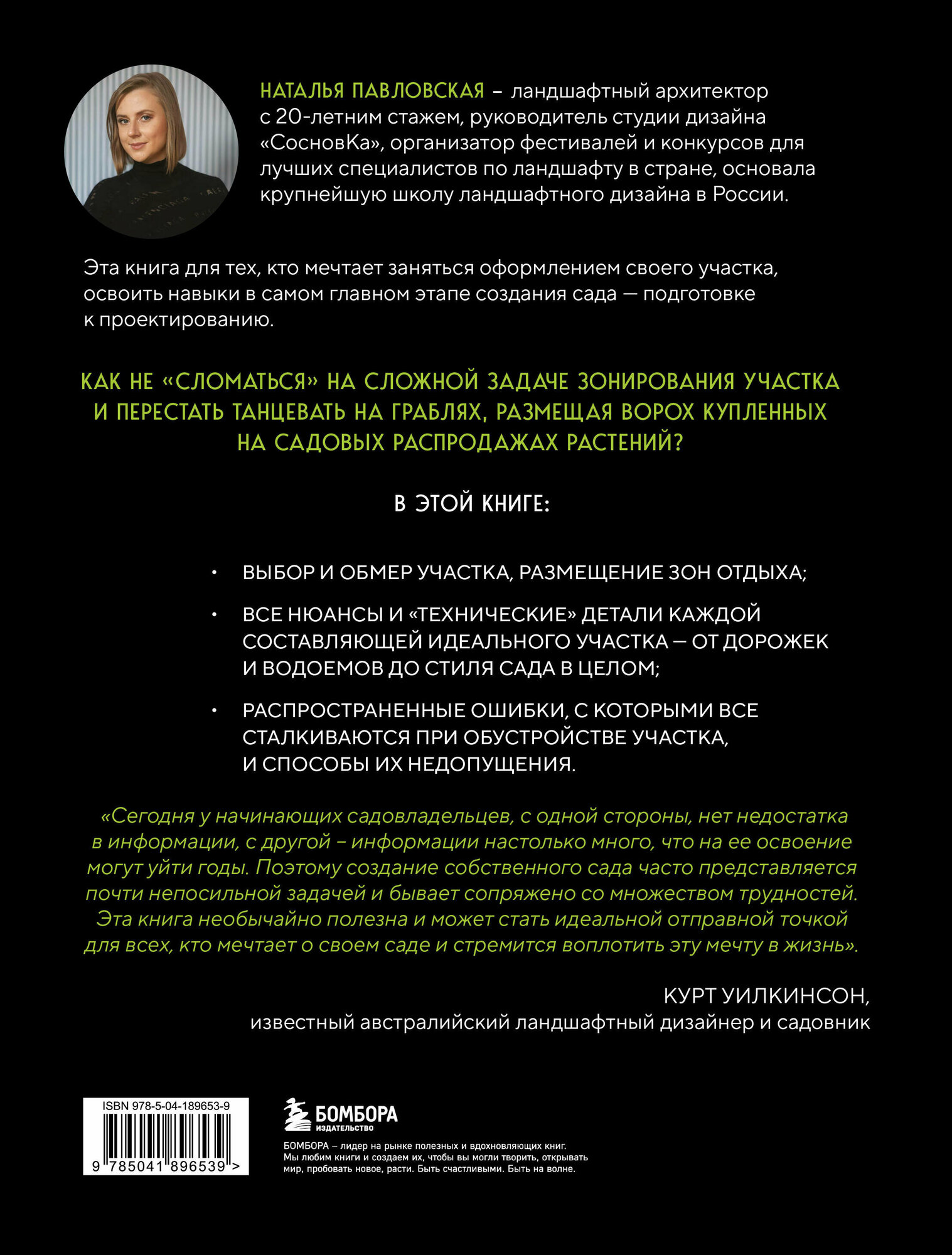Эта книга для тех, кто мечтает заняться оформлением своего участка, освоить навыки в самом главном этапе создания сада — подготовке к проектированию. Ландшафтный архитектор с 20-летним опытом, подскажет как не "сломаться" на сложной задаче зонирования участка и перестать танцевать на граблях, размещая ворох купленных на садовых распродажах растений. Автор шаг за шагом научит создавать уникальный ландшафтный проект, учитывающий особенности участка: от его выбора и обмера до планирования освещения и размещения дорожек и водоема. Вы найдете описания садовых стилей и доступные дизайнерские решения. Эта книга — не просто сборник идей, а поэтоапное руководство, заботливо сопровождающее на пути к созданию сада вашей мечты.