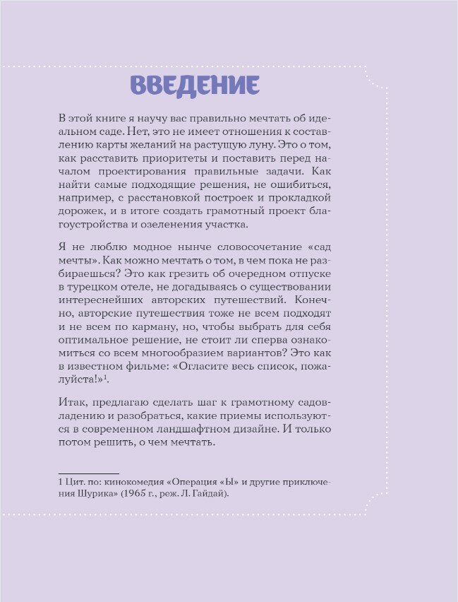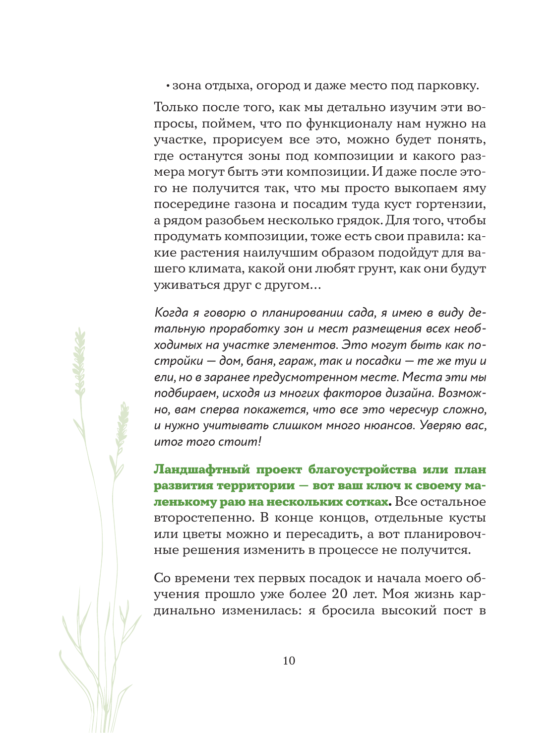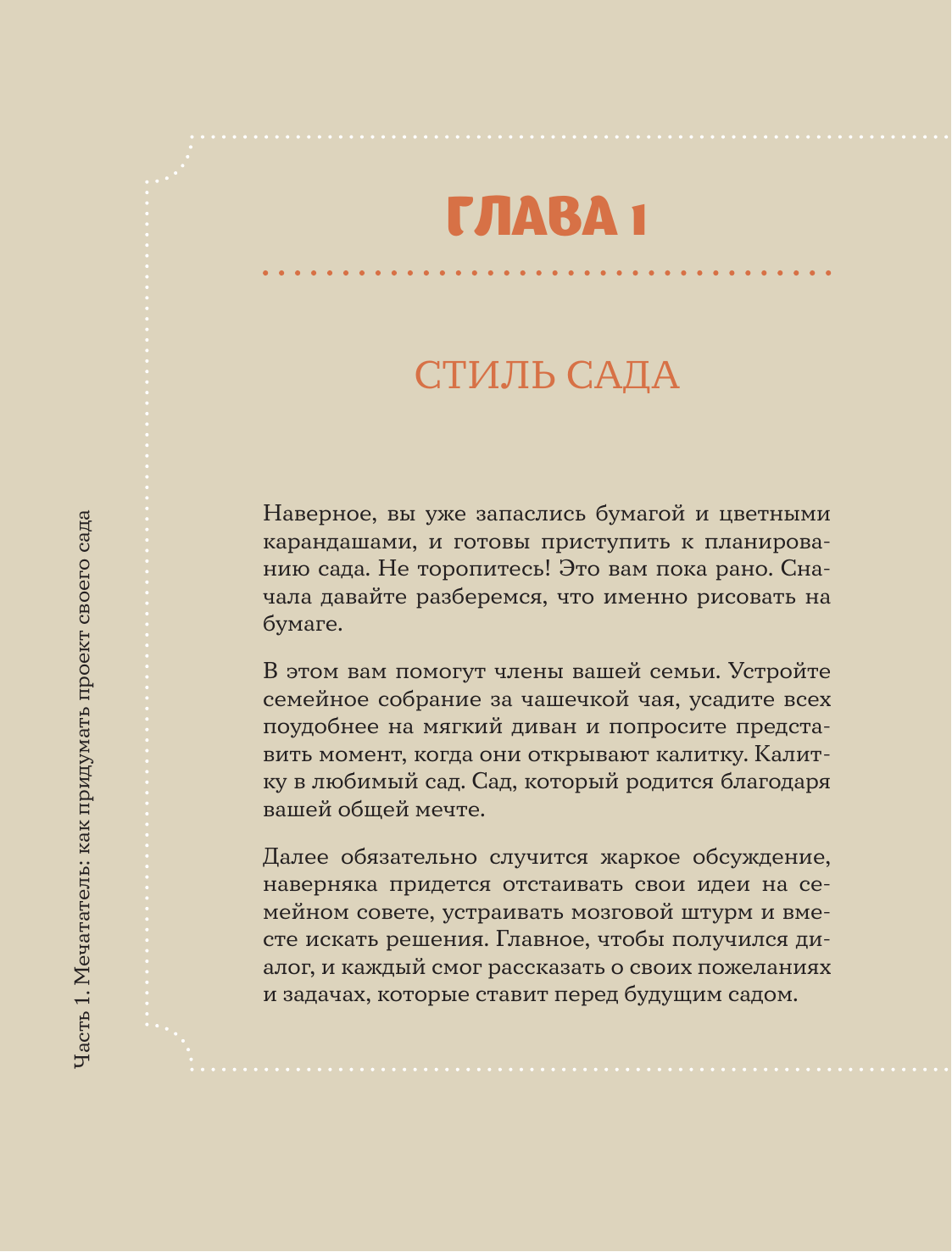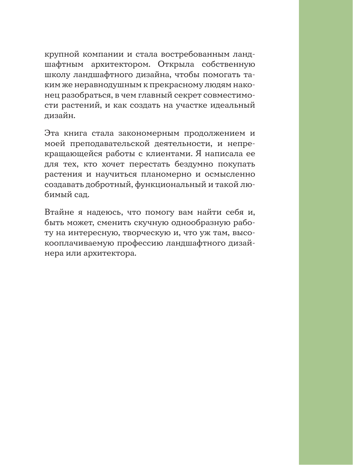 Эта книга для тех, кто мечтает заняться оформлением своего участка, освоить навыки в самом главном этапе создания сада — подготовке к проектированию. Ландшафтный архитектор с 20-летним опытом, подскажет как не "сломаться" на сложной задаче зонирования участка и перестать танцевать на граблях, размещая ворох купленных на садовых распродажах растений. Автор шаг за шагом научит создавать уникальный ландшафтный проект, учитывающий особенности участка: от его выбора и обмера до планирования освещения и размещения дорожек и водоема. Вы найдете описания садовых стилей и доступные дизайнерские решения. Эта книга — не просто сборник идей, а поэтоапное руководство, заботливо сопровождающее на пути к созданию сада вашей мечты.