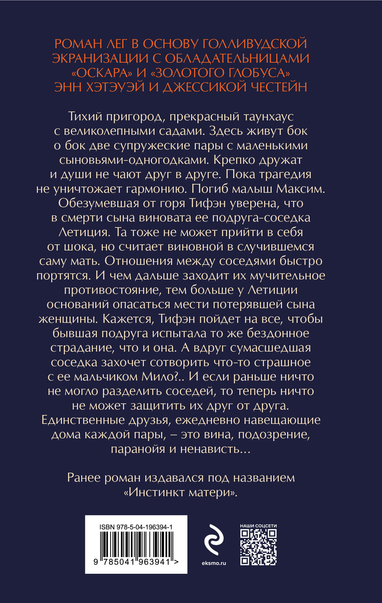 Тихий пригород, прекрасный таунхаус с великолепными садами. Здесь живут бок о бок две супружеские пары с маленькими сыновьями-одногодками. Крепко дружат и души не чают друг в друге. Пока трагедия не уничтожает гармонию. Погиб малыш Максим. Обезумевшая от горя Тифэн уверена, что в смерти сына виновата ее подруга-соседка, Летиция. Та тоже не может прийти в себя от шока, но считает виновной в случившемся саму мать. Отношения между соседями быстро портятся. И чем дальше заходит их мучительное противостояние, тем больше у Летиции оснований опасаться мести потерявшей сына женщины. Кажется, Тифэн пойдет на все, чтобы бывшая подруга испытала то же бездонное страдание, что и она. А вдруг сумасшедшая соседка захочет сотворить что-то страшное с ее мальчиком, Мило?.. И если раньше ничто не могло разделить соседей, то теперь ничто не может защитить их друг от друга. Единственные друзья, ежедневно навещающие дома каждой пары, – это вина, подозрение, паранойя и ненависть…