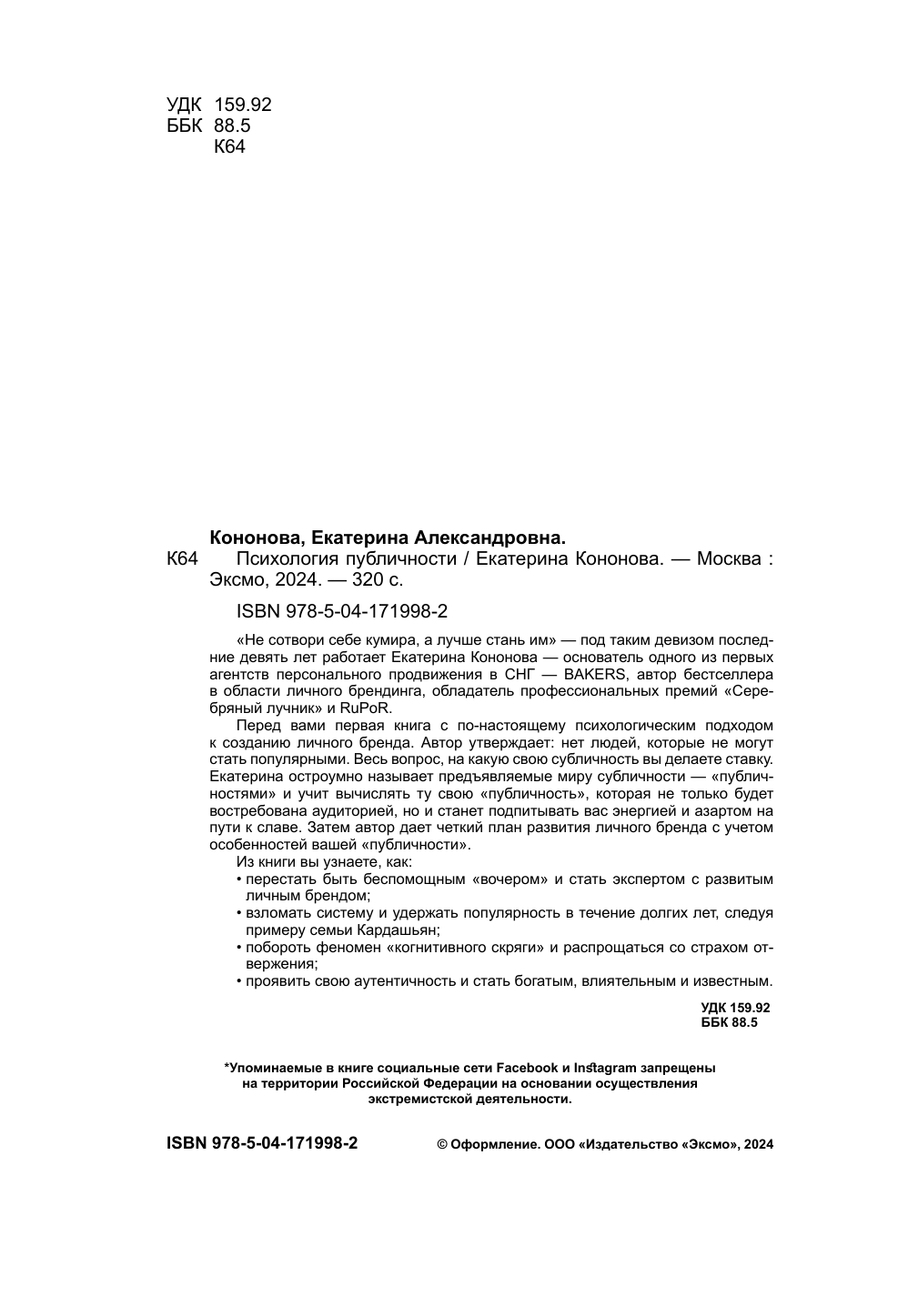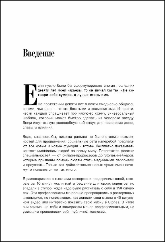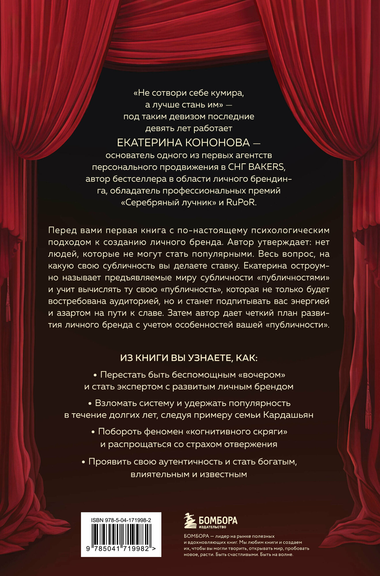 "Не сотвори себе кумира, а лучше стань им" - под таким девизом последние девять лет работает Екатерина Кононова – основатель одного из первых агентств персонального продвижения в СНГ – BAKERS, автор бестселлера в области личного брендинга, обладатель профессиональных премий "Серебряный лучник" и RuPoR. Перед вами первая книга с по-настоящему психологическим подходом к созданию личного бренда. Автор утверждает: нет людей, которые не могут стать популярными. Весь вопрос, на какую свою субличность вы делаете ставку. Екатерина остроиумно называет предъявляемые миру субличности - "публичностями", и учит вычислять ту свою "публичность", которая не только будет востребована аудиторией, но и станет подпитывать вас энергией и азартом на пути к славе. Затем автор дает четкий план развития личного бренда с учетом особенностей вашей "публичности". Из книги вы узнаете, как: • Перестать быть беспомощным "вочером", и стать экспертом с развитым личным брендом • Взломать систему и удержать популярность в течение долгих лет, следуя примеру семьи Кардашьян • Побороть феномен "когнитивного скряги" и распрощаться со страхом отвержения • Проявить свою аутентичность и стать богатым, влиятельным и известным