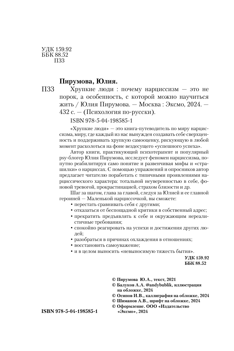 Хрупкие люди. Почему нарциссизм - это не порок а особенность с которой можно научиться жить (Пирумова Юлия); ООО "Издательство "Эксмо", 2024