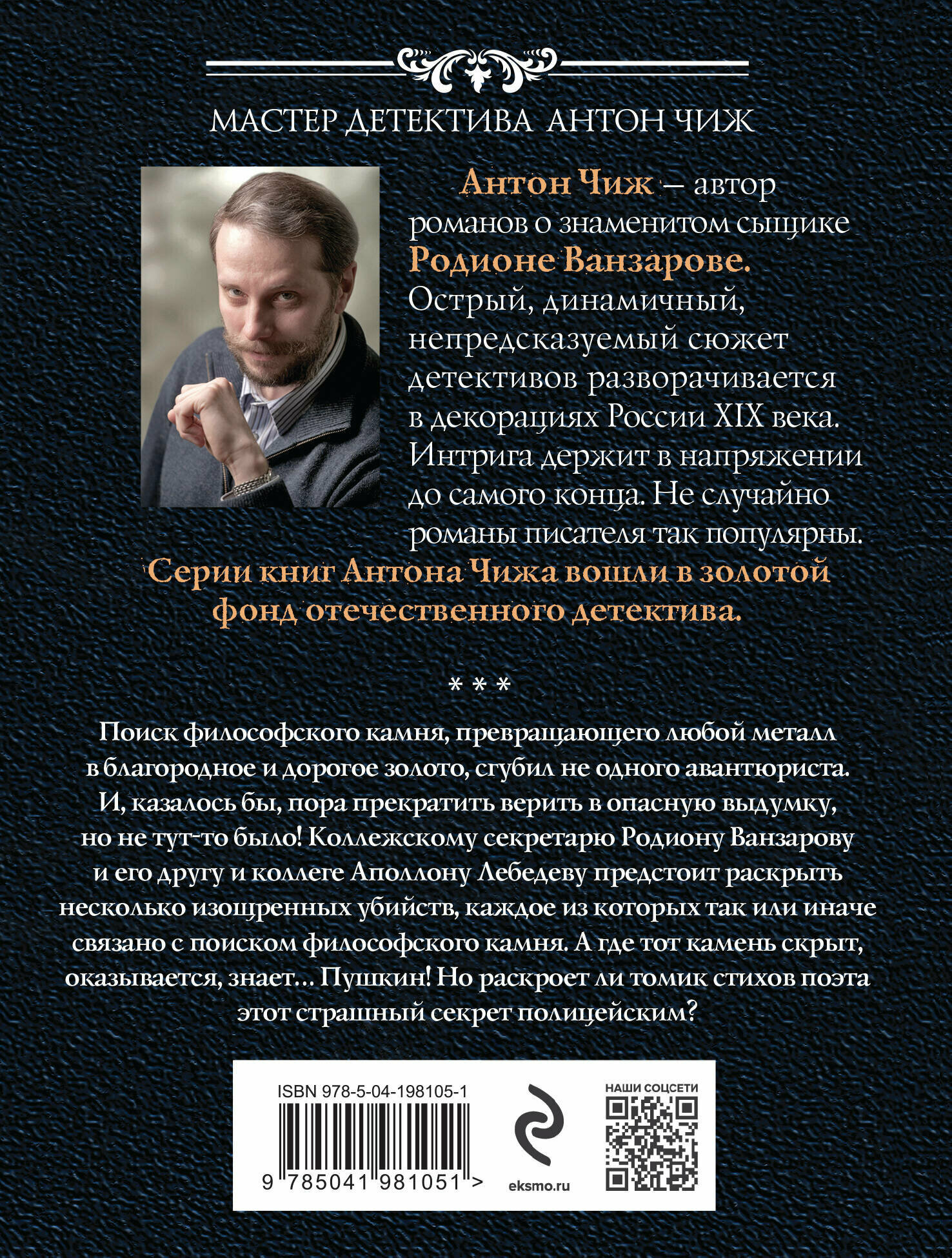 Поиск философского камня, превращающего любой металл в благородное и дороге золото, сгубил не одного авантюриста. И, казалось бы, пора прекратить верить в опасную выдумку, но не тут-то было! Коллежскому секретарю Родиону Ванзарову и его другу и коллеге Аполлону Лебедеву предстоит раскрыть несколько изощренных убийств, каждое из которых так или иначе связано с поиском философского камня. А где тот камень скрыт, оказывается, знает… Пушкин! Но раскроет ли томик стихов поэта этот страшный секрет полицейским?