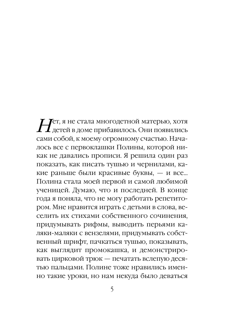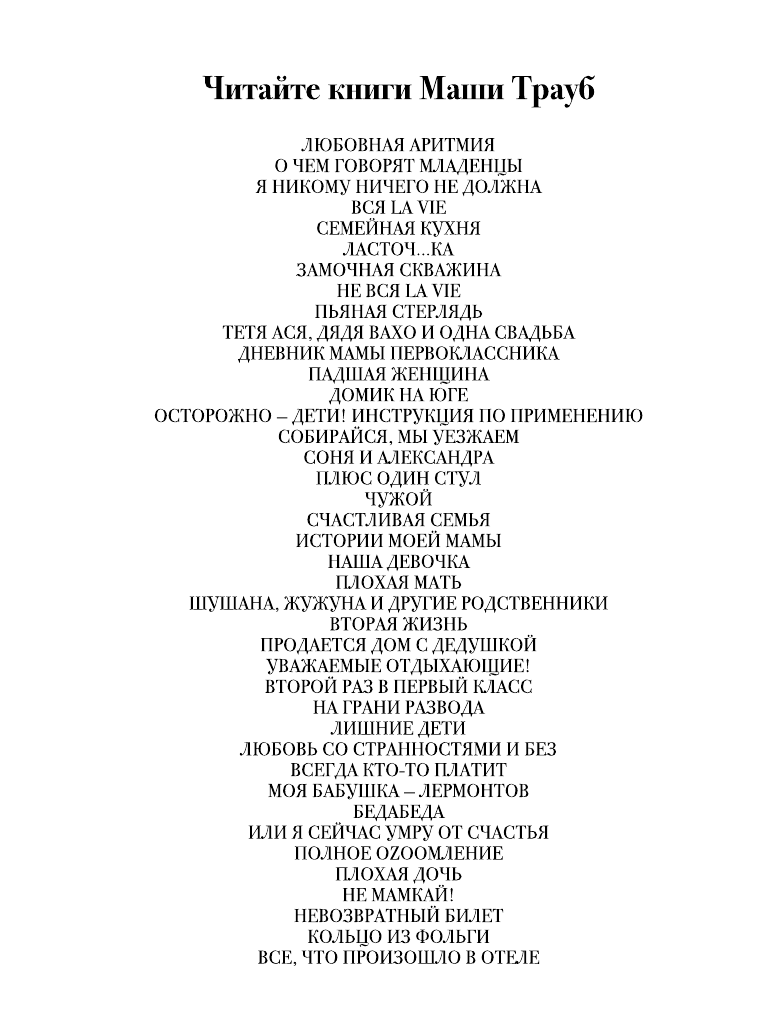 Эта книга сложилась из тех самых пресловутых пометок в блокноте, о которых так часто спрашивают читатели. Пометки я делаю редко, потому что все равно забываю, куда записала. Даже этот блокнот сохранила лишь по той причине, что в нем рисовала двухлетняя малышка, дочь моей подруги, а ее сестра-первоклассница придумывала собственный шрифт. В этом же блокноте я писала для нее смешные рифмы и объясняла разницу между твердым и мягким знаками, которые первоклашке казались одинаковыми. "Ну кто все эти буквы изобрел? Они о детях вообще думали?" — возмущалась моя ученица… И здесь же — заметки на строчку, две, абзац. Реальные ситуации, которые меня чем-то потрясли, удивили, рассмешили. Эта книга — коллекция маленьких историй о больших чувствах. Маша Трауб