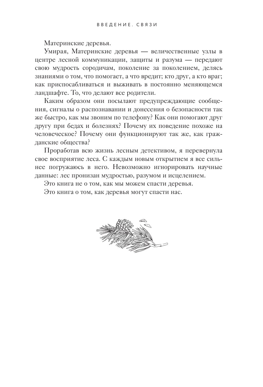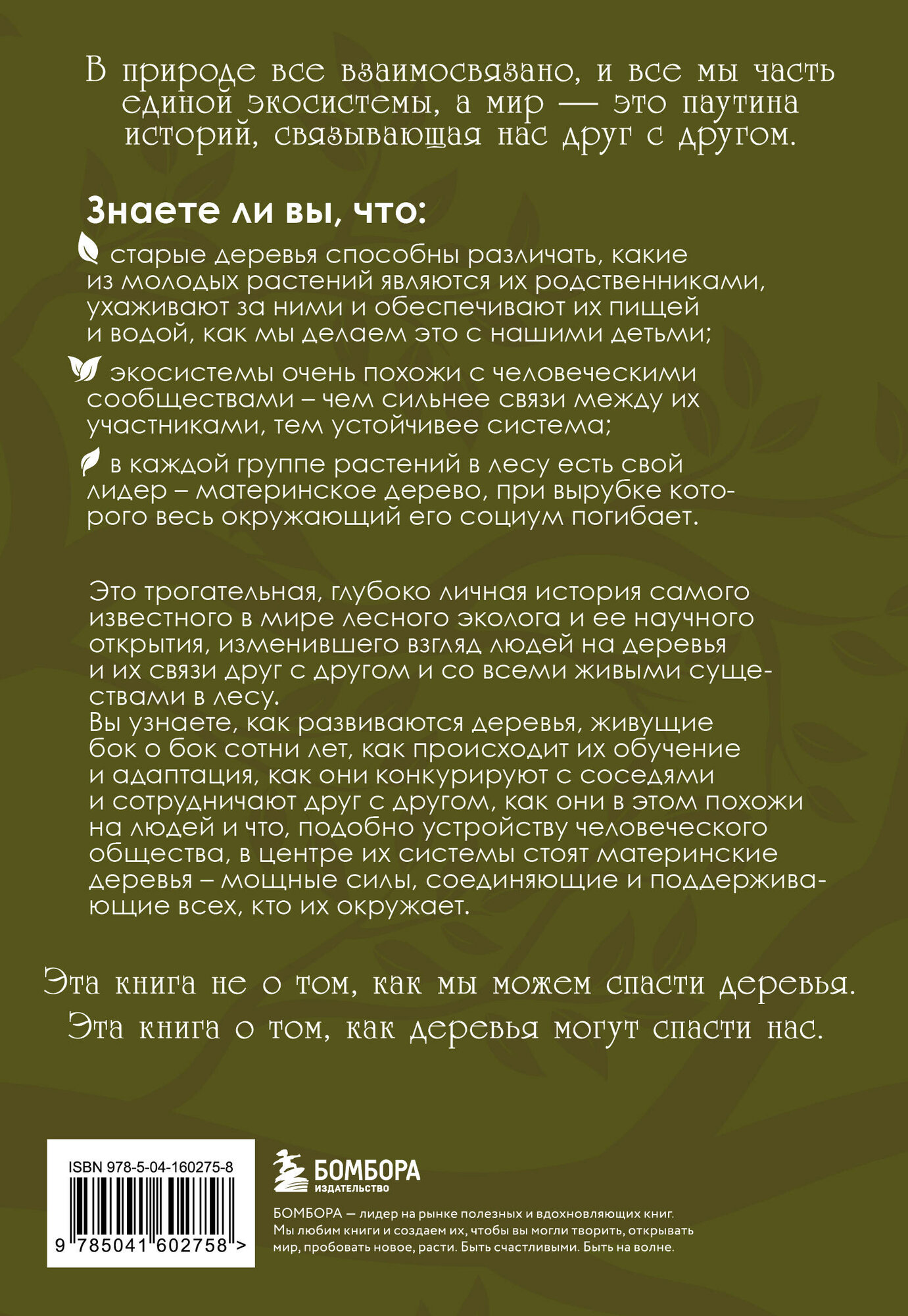 Взаимодействие личного повествования, научных открытий и удивительных откровений о жизни леса создают захватывающий сюжет, который в очередной раз демонстрирует нам тесную связь человека и природы. Книга Сюзанны Симард, профессора экологии леса из университета Британской Колумбии, рассказывает нам, как развиваются деревья, живущие бок о бок сотни лет, как происходит их обучение и адаптация, как они конкурируют с соседями и сотрудничают друг с другом, как они в этом похожи на людей и как, подобно устройству человеческого общества, в центре их общества стоят Материнские деревья – мощные силы, соединяющие и поддерживающих всех, кто их окружает.