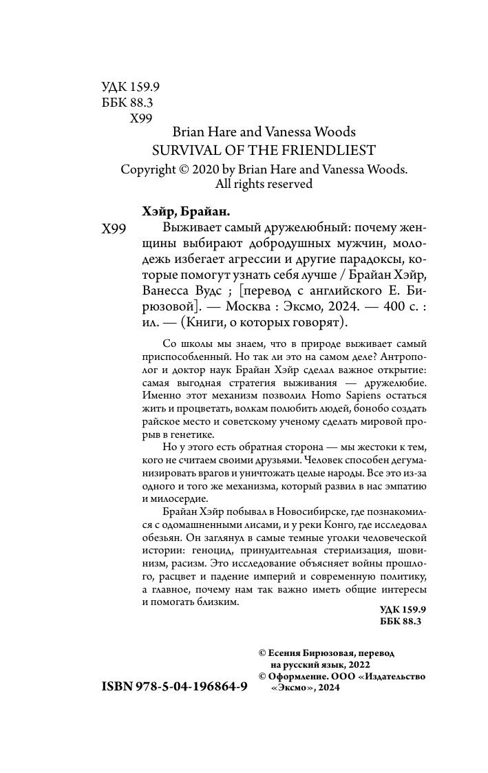 Выживает самый дружелюбный. Почему женщины выбирают добродушных мужчин молодежь избегает агрессии и другие парадоксы которые помогут узнать себя луч (Хэйр Брайан, Вудс Ванесса); ООО "Издательство "Эксмо", 2024