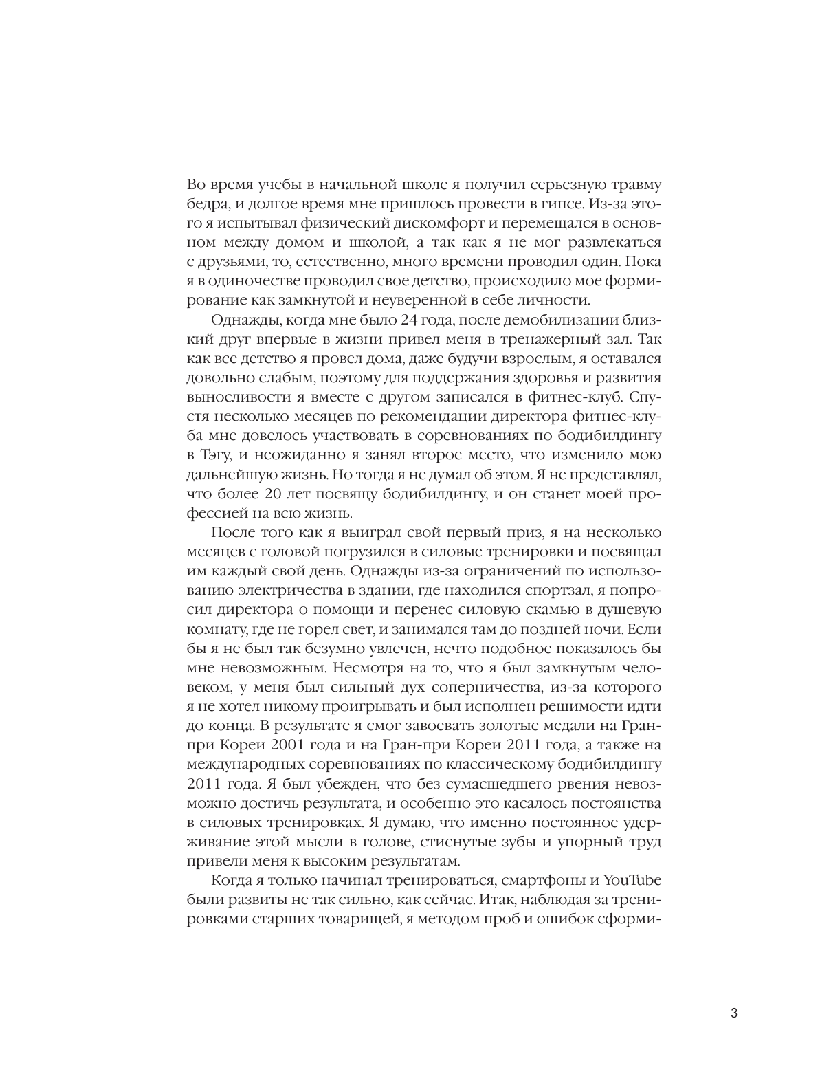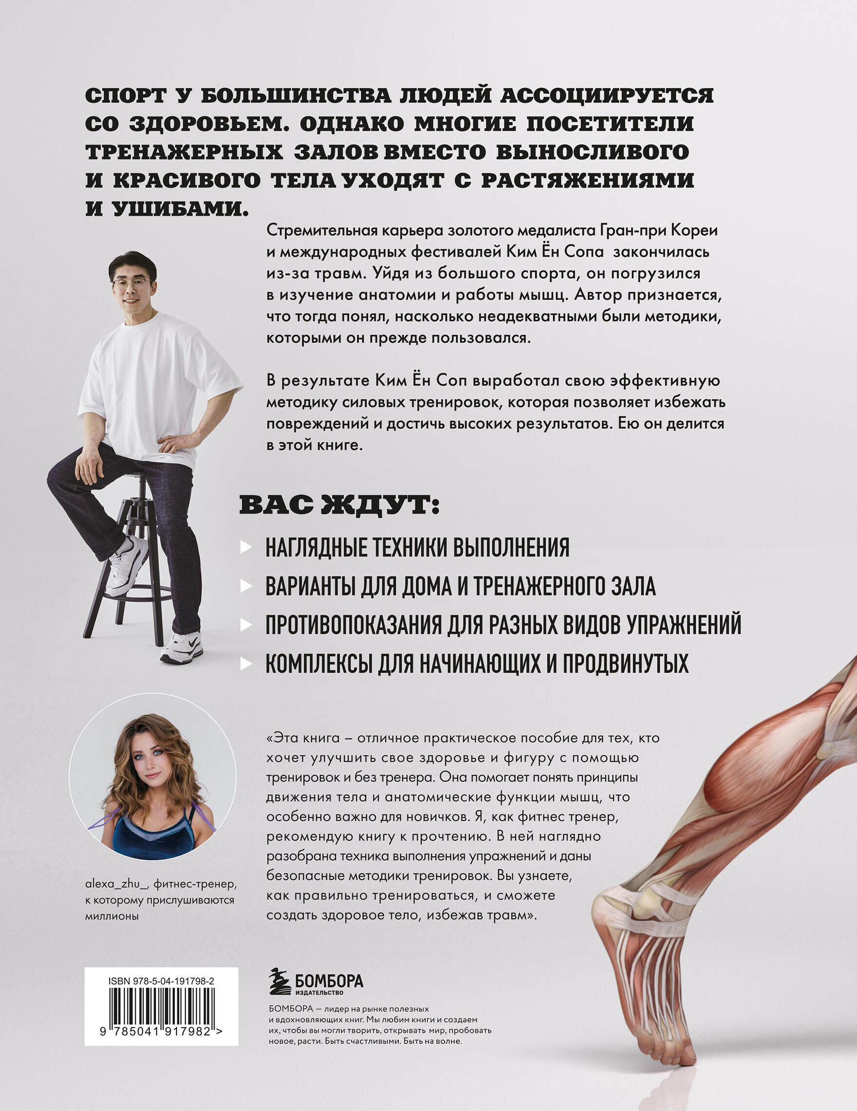Книга от пройессионального корейского бодибилдера, дважды бравшего золотые медали на Гран-при Кореи и побеждавшего на международных соревнованиях. Закончив свой профессиональный путь из-за травмы и углубившись в тему анатомии тренировок, Ким Ен Соп создал уникальную систему, которой поделится с читателями. Из книги вы узнаете, как достигать желаемых результатов без вреда для здоровья.