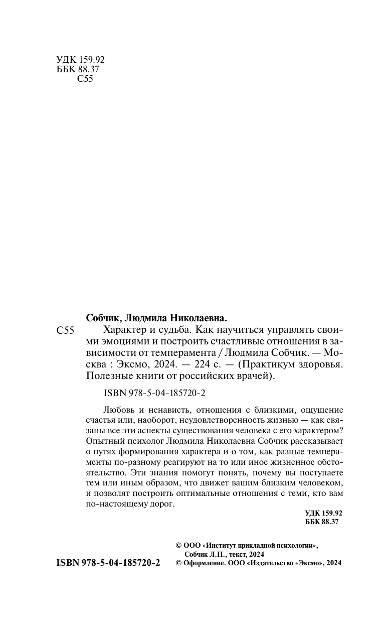 Характер и судьба. Как научиться управлять своими эмоциями и построить счастливые отношения в зависимости от темперамента (Собчик Людмила Николаевна); ООО "Издательство "Эксмо", 2024