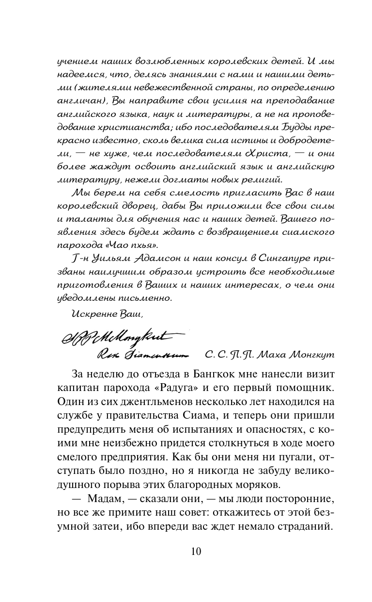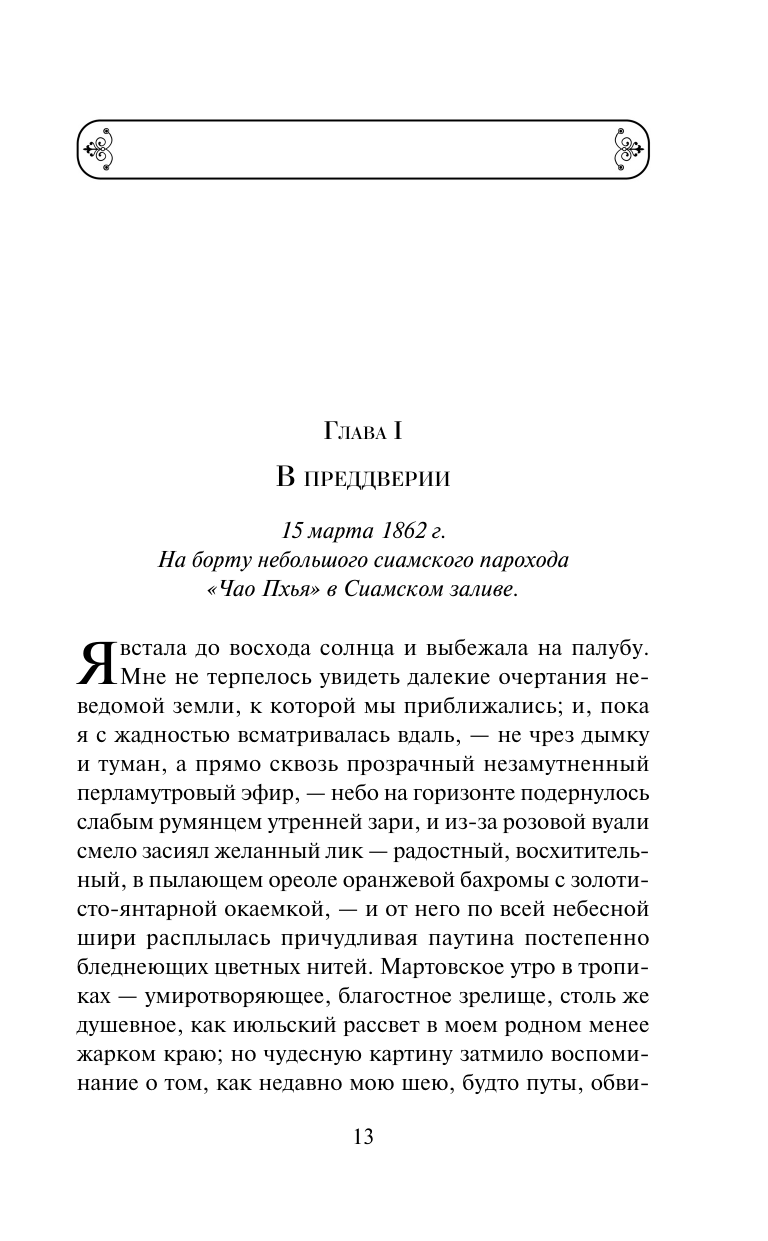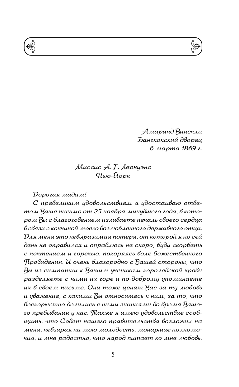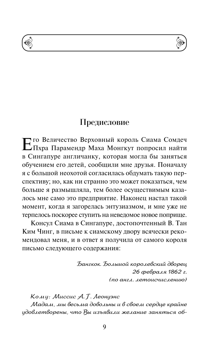 Анна Леонуэнс – авантюристка и суфражистка. Всю жизнь она скрывала свой возраст и историю своего происхождение, вместе с миссионерами путешествовала по Египту и Палестине, выступала против рабства, 6 лет преподавала в гареме короля Сиама (Таиланда) и вошла в историю как самая известная английская гувернантка. Оставшись вдовой в 28 лет с маленьким сыном и дочерью на руках, Анна открыла школу в Сингапуре для детей британских офицеров. Вскоре она получила приглашение от короля Сиама преподавать английский его 82 отпрыскам и 39 женам. Это книга-впечатление о жизни во дворце, о суровых правилах гарема, о культуре и обычаях Сиама. В 1870 году Анна опубликовала свои воспоминания о загадочной азиатской стране, в которой правят два короля, поклоняются белому слону и кремируют царственных покойников через год после их смерти. Сказания о Сиаме поразили современников, и книга тут же стала бестселлером. Особый дух изданию придают 18 штриховых иллюстраций. Книга впервые издается на русском языке.