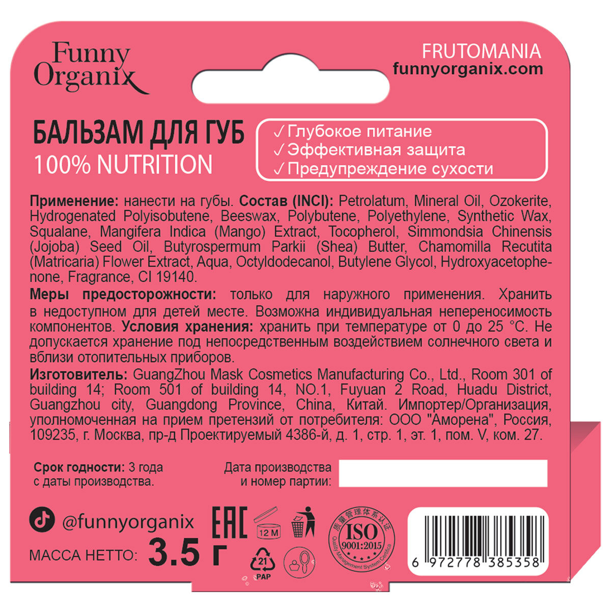 Бальзам для губ 100% Nutrition Funny Organix/Фанни Органикс 35г GuangZhou Mask Cosmetics Manufacturing Co., Ltd (2952236)