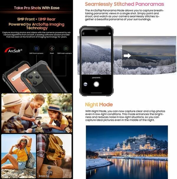 Blackview BV5300 Plus - защищенный смартфон, который использует алгоритмы камеры ArcSoft, включая Panorama, Beauty, HDR и Portrait, для 8-мегапиксельной передней и 13-мегапиксельной основной камер. Blackview BV5300 Plus оснащен 6,1-дюймовым дисплеем HD+ с режимом в перчатках. Работая на версии Doke OS 4.0 на базе Android 13, восьмиядерном процессоре и до 16 ГБ ОЗУ с аккумулятором емкостью 6580 мАч, BV5300 Pro готов к любым рабочим нагрузкам.
