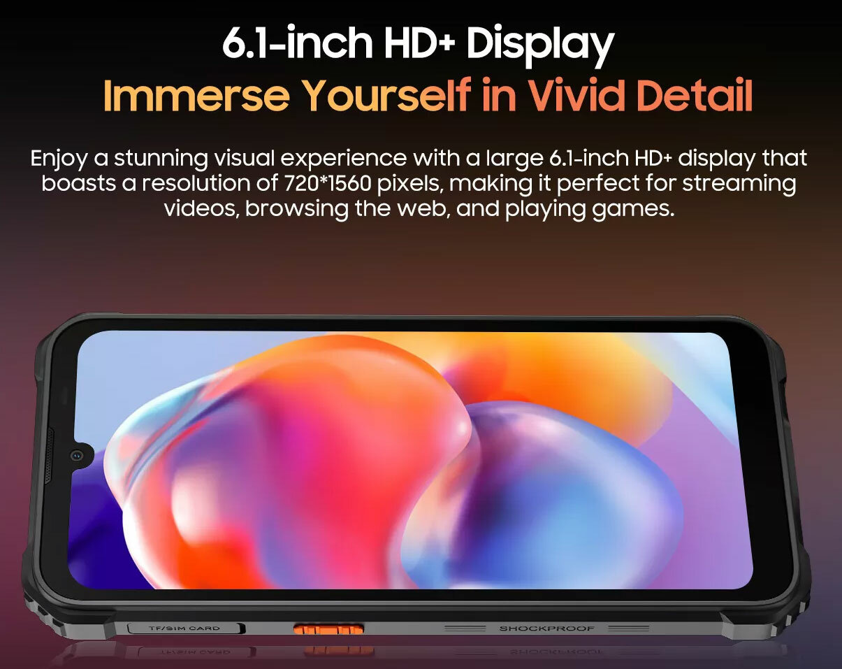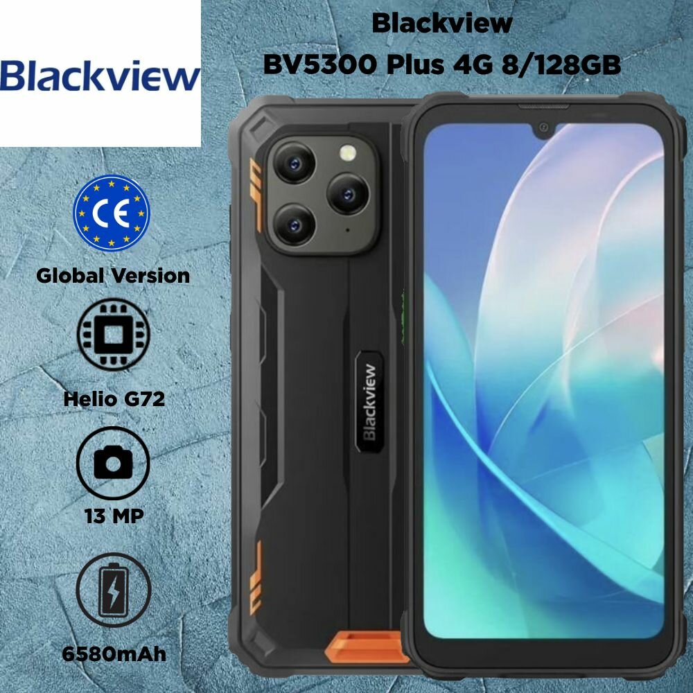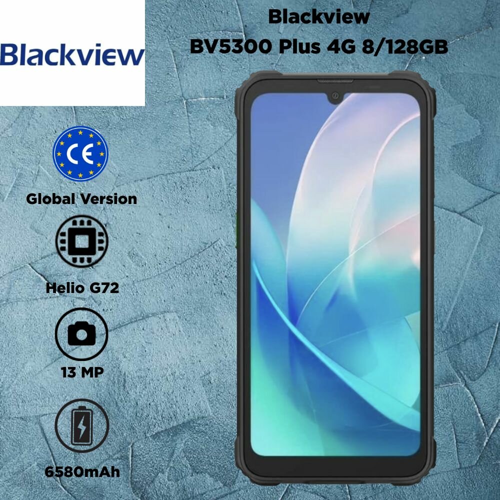 Blackview BV5300 Plus - защищенный смартфон, который использует алгоритмы камеры ArcSoft, включая Panorama, Beauty, HDR и Portrait, для 8-мегапиксельной передней и 13-мегапиксельной основной камер. Blackview BV5300 Plus оснащен 6,1-дюймовым дисплеем HD+ с режимом в перчатках. Работая на версии Doke OS 4.0 на базе Android 13, восьмиядерном процессоре и до 16 ГБ ОЗУ с аккумулятором емкостью 6580 мАч, BV5300 Pro готов к любым рабочим нагрузкам.