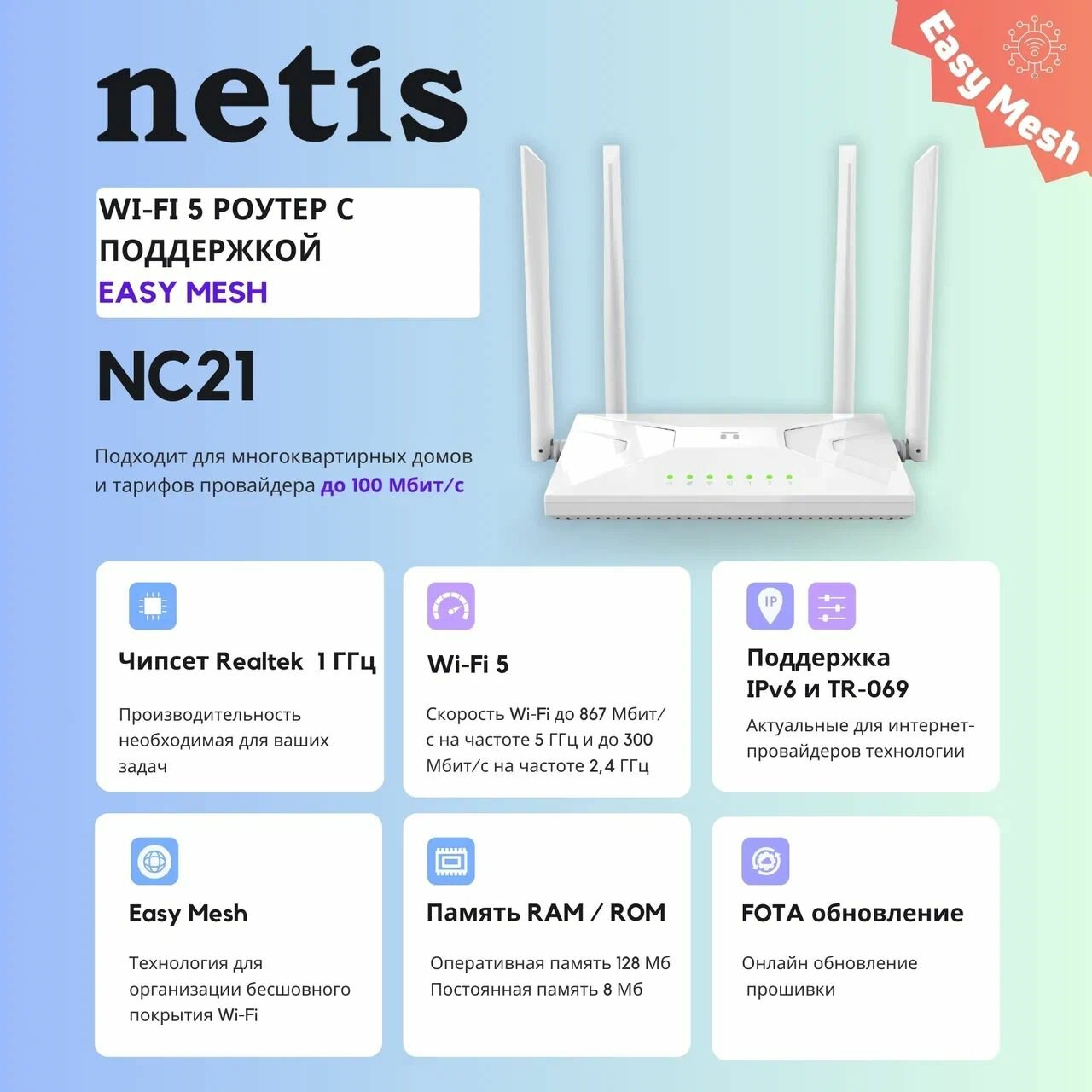 Роутер WiFi netis АС1200 24-5ГГц 300-867 Мбит/с LAN 3x100 Мбит/с WAN 1x100 Мбит/с 4x5dBi антенны NC21