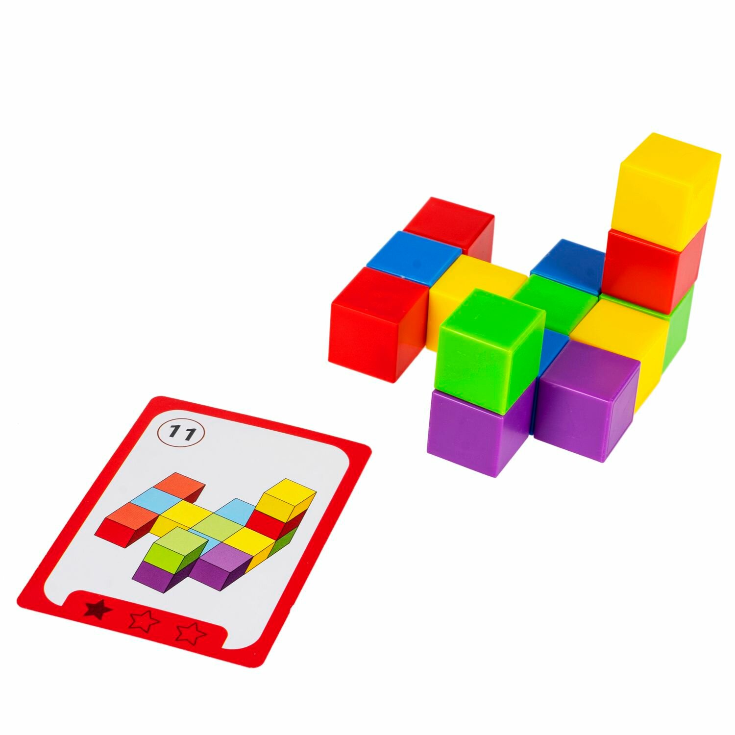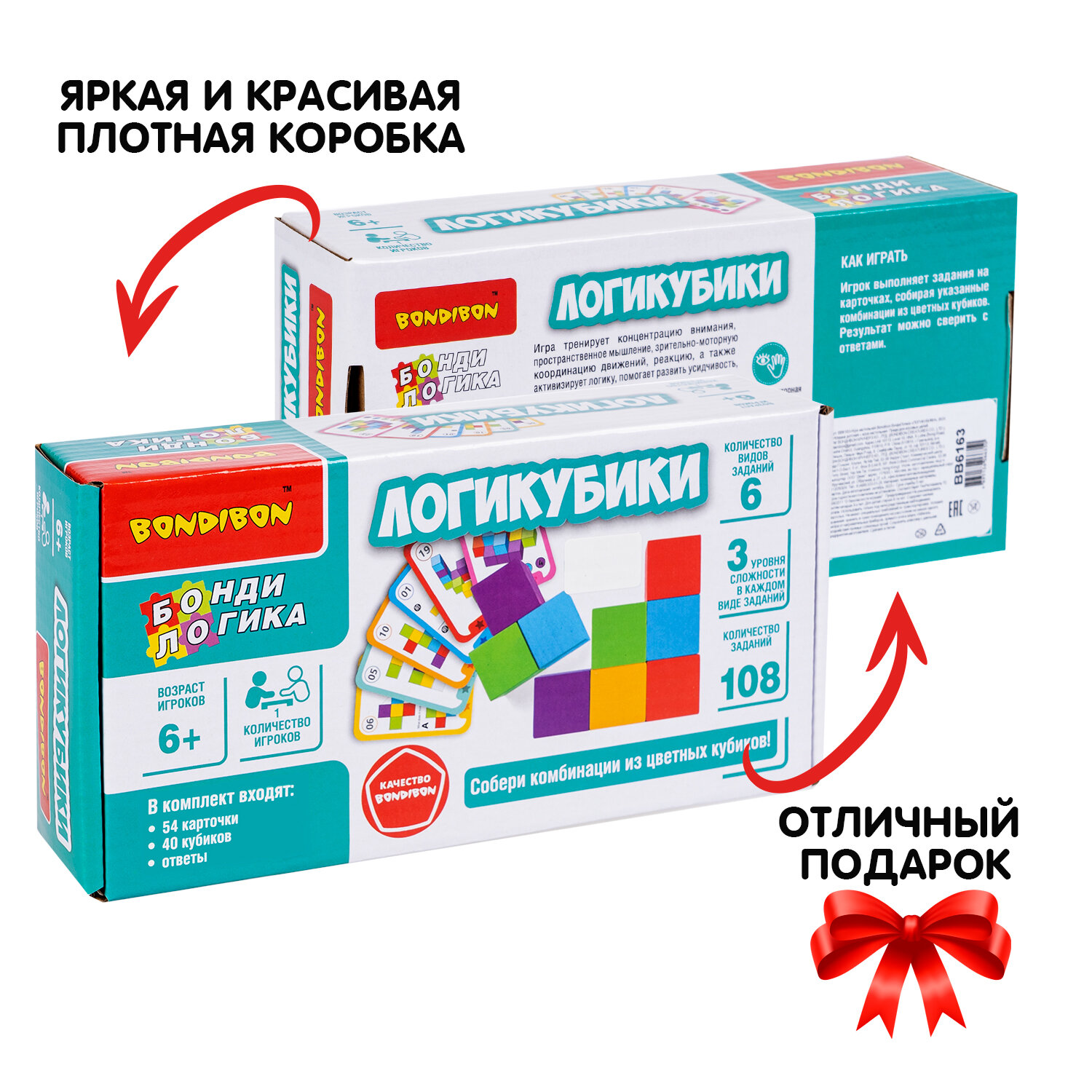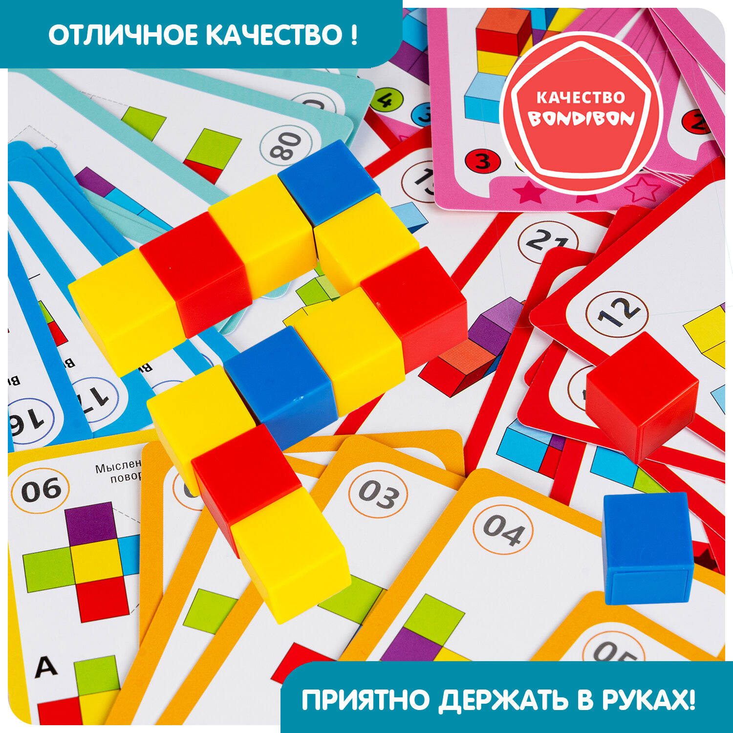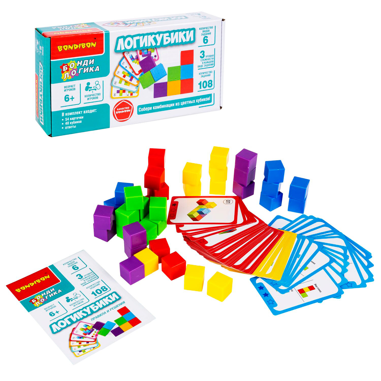 Яркая головоломка со множеством заданий разных уровней сложности и деталями в виде разноцветных кубиков! Настольная логическая игра серии БондиЛогика от Bondibon придется по вкусу дошкольникам и младшим школьникам. Выберите карточку с заданием попроще или посложнее, ориентируясь на возраст игрока. Выполняйте задание, собирая изображенную комбинацию из цветных кубиков. Результат можно сверить с ответами.Увлекательная головоломка способствует изучению основных цветов, развитию интереса к конструированию, моделированию, тренирует концентрацию внимания, координацию движений, усидчивость, пространственное и логическое мышления.В набор входят: 54 карточки, 40 кубиков, ответы.В каждом из 6 видов заданий 3 уровня сложности.Возраст 6+ Количество игроков 1Развивающие интересные настолки для детей, настольные игры для компании и развивашки для девочек и мальчиков – популярные игры для всей семьи. Оригинальные головоломки типа тетрис, развлечения с геометрическими фигурами и фигурками понравятся детям. Логические игрушки для девочек и мальчиков в игровой форме готовят ребят к школе и помогают освоить 3D моделирование. Умные игры – настоящий подарок для детей, отправляющихся в дорогу. Прикольные настольные игрушки для ребенка пригодятся для игры на столе, на воздухе и на природе. Настолки для детей и крутую мини игру можно взять с собой в машину и в детский сад. Логические задания подойдут для улицы и уличных развлечений. Крутая настольная игра с картинками – тренировка iq и памяти, логики и мелкой моторики. Такие игры – настоящий нейротренажер и взрыв мозга! Учимся, играя – эффективная стратегия развития малыша. Коробка с игрой от Бондибон – оригинальный подарок, дополнение в набор на день рождения и на любой праздник. Детские игрушки – популярные товары круглый год!