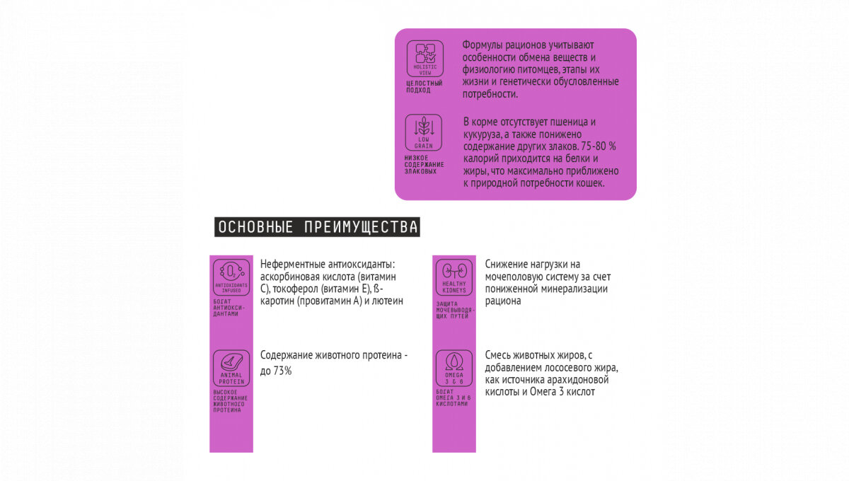 Обеспечивает питомцев высококачественным белком и жирными кислотами; высокое содержание белка улучшает вкусовую привлекательность корма и способствует более охотному его поеданию. Сбалансированный состав минералов и витаминов способствует улучшению самочувствия питомца и укреплению его иммунитет. Жиры и жирорастворимые витамины улучшают шерсть и укрепляют защиту кожи. Антиоксидантная защита организма препятствует разрушению здоровых клеток свободными радикалами, предотвращая преждевременное старение. Помогает разнообразить рацион привередливых кошек и получить больше питательных веществ, необходимых питомцу.