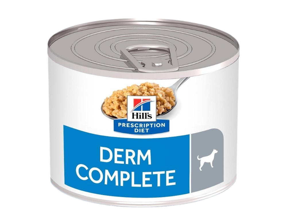 Диетический влажный корм для собак (консервы) Hill's Prescription Diet Derm Complete для заботы о здоровье кожи при пищевой аллергии и аллергии на компоненты окружающей среды у собак. Помогает укрепить кожный барьер. Помогает уменьшить проявления пищевой аллергии. Помогает снизить интенсивность иммунного ответа при аллергии на компоненты окружающей среды. Помогает контролировать зуд и другие признаки аллергии на компоненты окружающей среды и способствует восстановлению кожи. Клинически доказано: помогает контролировать зуд и другие признаки аллергии на компоненты окружающей среды, а также поддерживает здоровье и восстановление кожи. Отмечен знаком S+OXSHIELD: разработан для улучшения состояния среды в мочевыделительной системе, снижает риск образования кристаллов струвита и оксалата кальция.Основные рекомендации: Поддержание здоровья кожи при вторичных инфекциях и других поражениях. Атопический дерматит (аллергия на компоненты окружающей среды). Большинство случаев неблагоприятной реакции на пищу, кроме подтвержденной аллергии на яйцо и его компоненты. Блошиный аллергический дерматит.- Наружный отит (хронический). Кожный зуд (дерматит). Энтеропатия, поддающаяся коррекции с помощью смены рациона.Не рекомендуется: Щенкам, беременным или кормящим собакам.