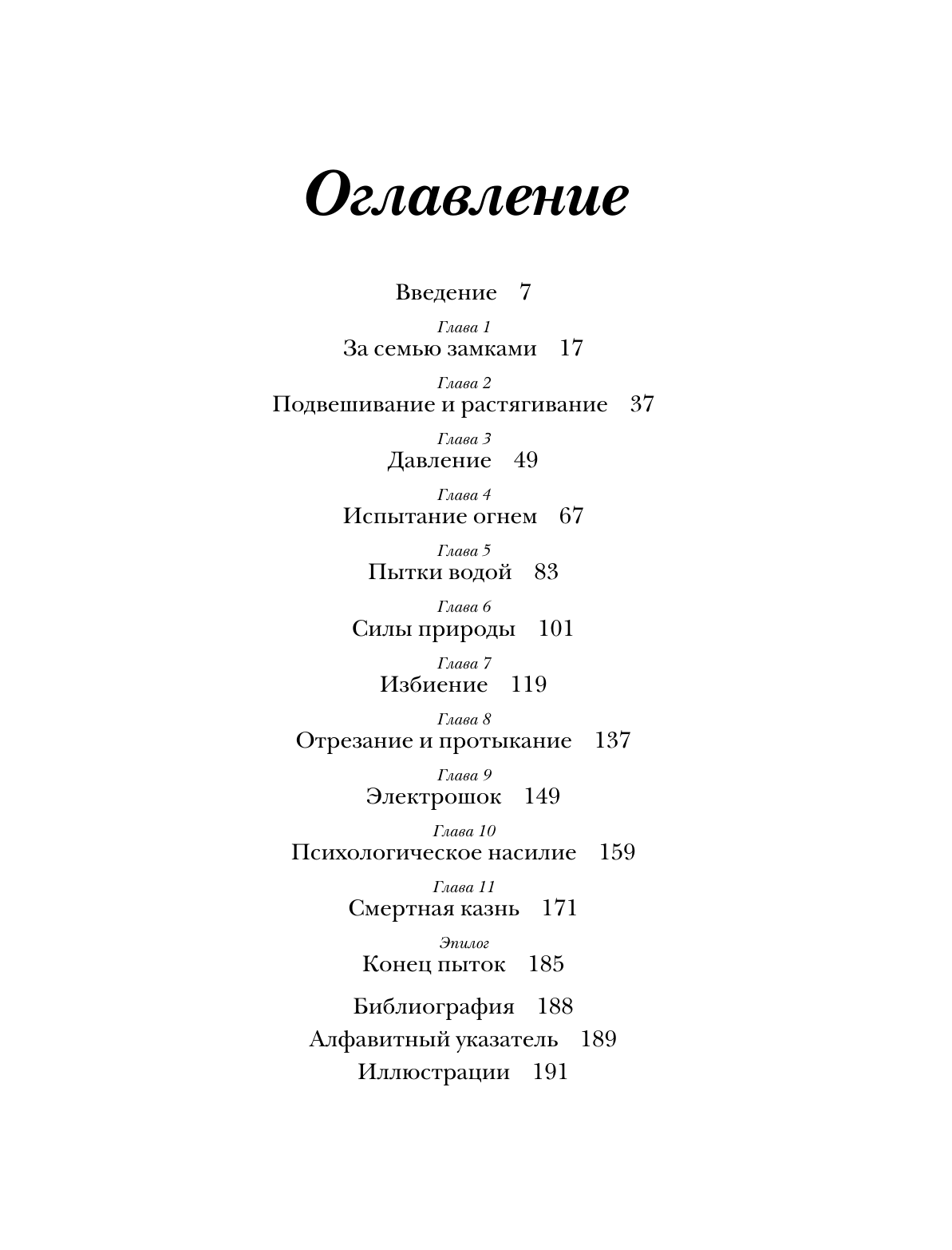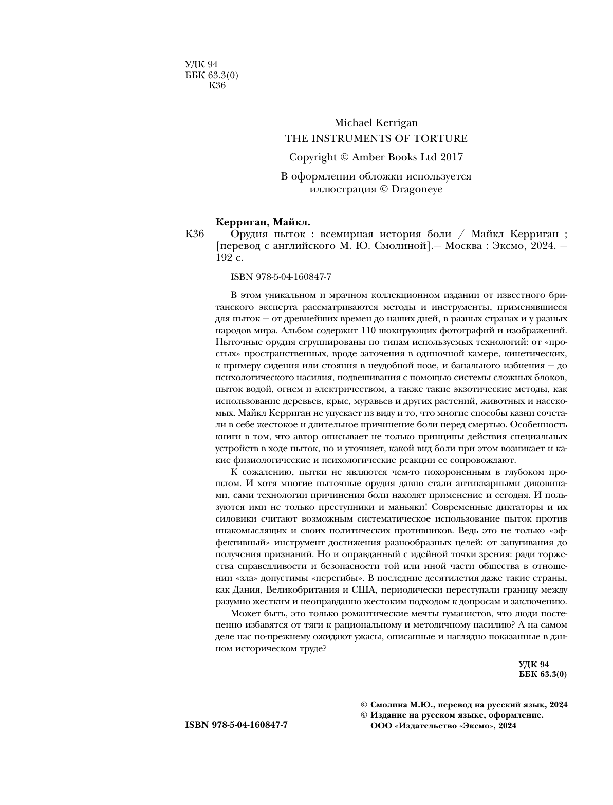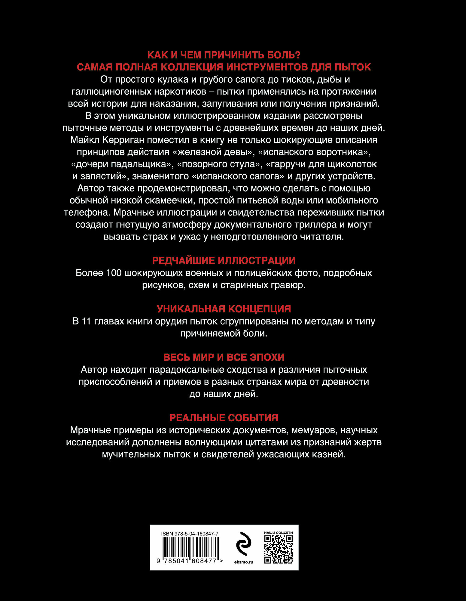 Как и чем причинить боль? Самая полная коллекция инструментов для пыток. От простого кулака и грубого сапога до тисков, дыбы и галлюциногенных наркотиков - пытки применялись на протяжении всей истории для наказания, запугивания или получения признаний. В этом уникальном иллюстрированном издании рассмотрены пыточные методы и инструменты с древнейших времен до наших дней. Майкл Керриган поместил в книгу не только шокирующие описания принципов действия "железной девы", "испанского воротника", "дочери падальщика", "позорного стула", "гарручи для щиколоток и запястий", знаменитого "испанского сапога" и других устройств. Автор также продемонстрировал, что можно сделать с помощью обычной низкой скамеечки, простой питьевой воды или мобильного телефона. Мрачные иллюстрации и свидетельства переживших пытки создают гнетущую атмосферу документального триллера и могут вызвать страх и ужас у неподготовленного читателя. Редчайшие иллюстрации Более 100 шокирующих военных и полицейских фото, подробных рисунков, схем и старинных гравюр. Уникальная концепция В 11 главах книги орудия пыток сгруппированы по методам и типу причиняемой боли. Весь мир и все эпохи Автор находит парадоксальные сходства и различия пыточных приспособлений и приемов в разных странах мира от древности до наших дней. Реальные события Мрачные примеры из исторических документов, мемуаров, научных исследований дополнены волнующими цитатами из признаний жертв мучительных пыток и свидетелей ужасающих казней.