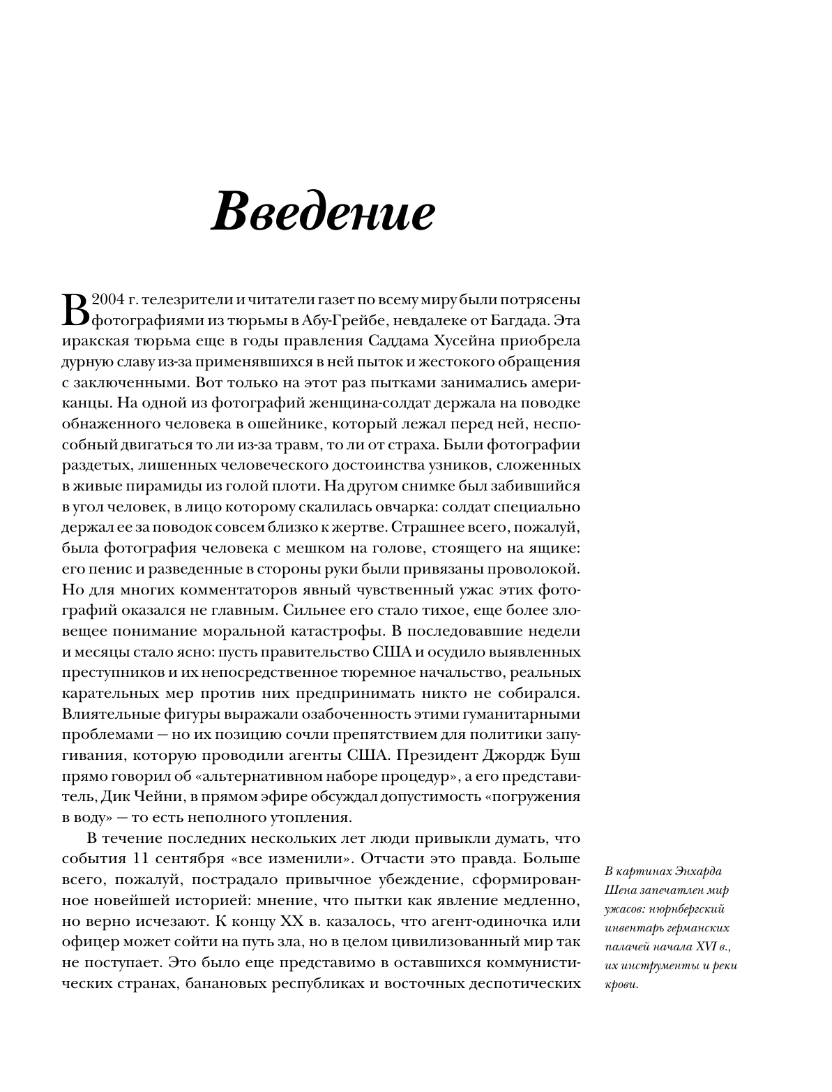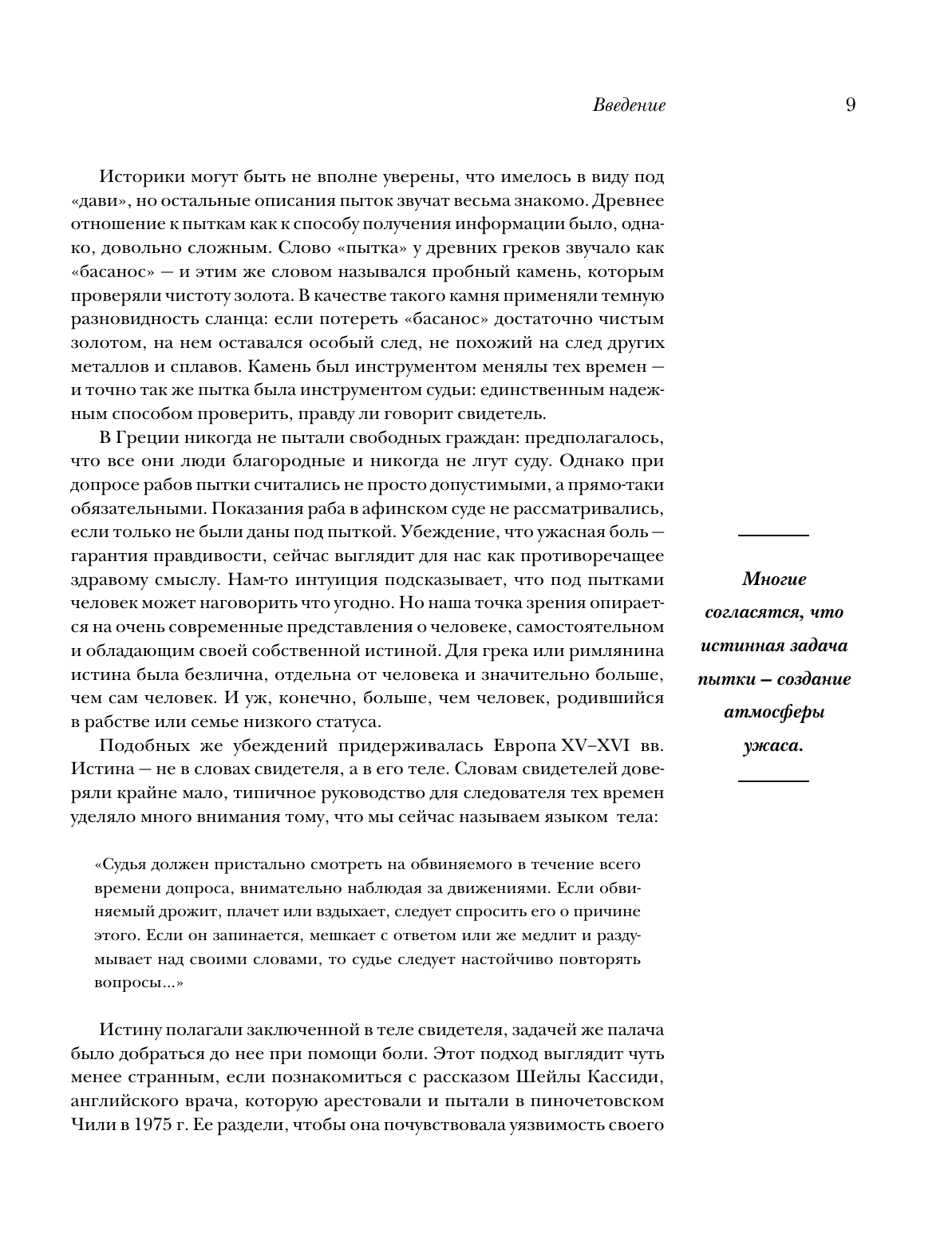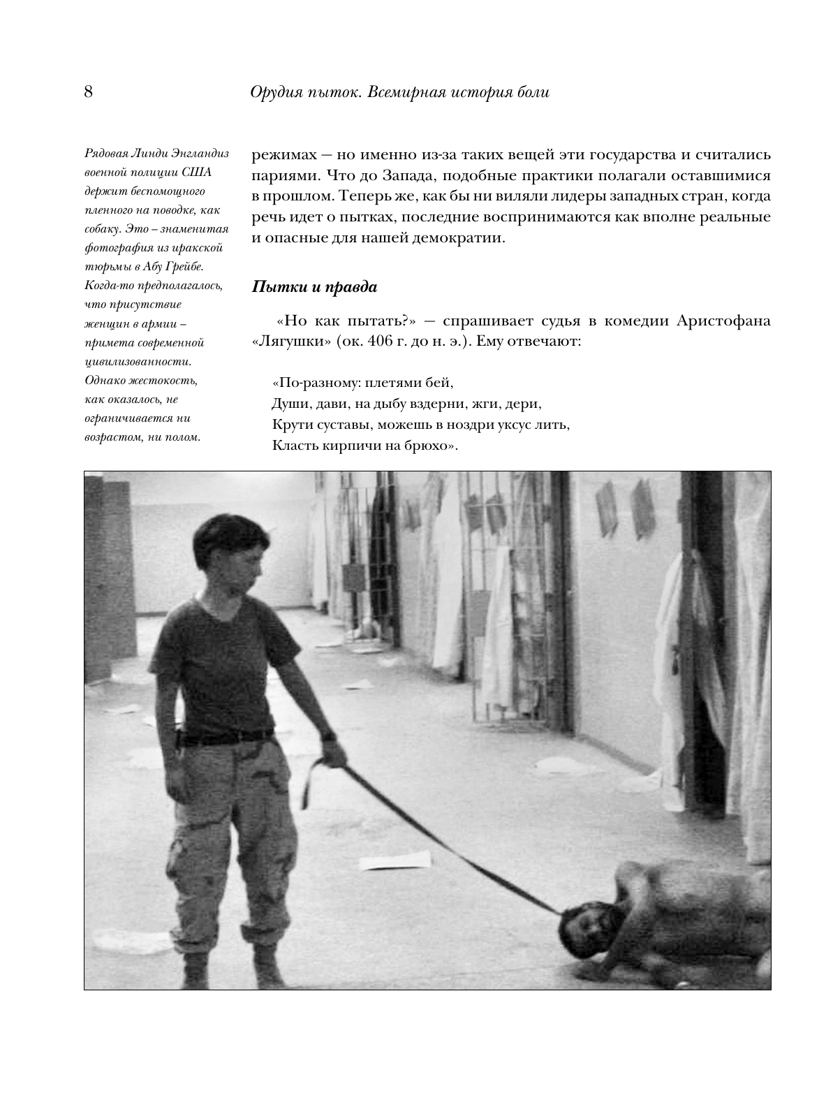 Как и чем причинить боль? Самая полная коллекция инструментов для пыток. От простого кулака и грубого сапога до тисков, дыбы и галлюциногенных наркотиков - пытки применялись на протяжении всей истории для наказания, запугивания или получения признаний. В этом уникальном иллюстрированном издании рассмотрены пыточные методы и инструменты с древнейших времен до наших дней. Майкл Керриган поместил в книгу не только шокирующие описания принципов действия "железной девы", "испанского воротника", "дочери падальщика", "позорного стула", "гарручи для щиколоток и запястий", знаменитого "испанского сапога" и других устройств. Автор также продемонстрировал, что можно сделать с помощью обычной низкой скамеечки, простой питьевой воды или мобильного телефона. Мрачные иллюстрации и свидетельства переживших пытки создают гнетущую атмосферу документального триллера и могут вызвать страх и ужас у неподготовленного читателя. Редчайшие иллюстрации Более 100 шокирующих военных и полицейских фото, подробных рисунков, схем и старинных гравюр. Уникальная концепция В 11 главах книги орудия пыток сгруппированы по методам и типу причиняемой боли. Весь мир и все эпохи Автор находит парадоксальные сходства и различия пыточных приспособлений и приемов в разных странах мира от древности до наших дней. Реальные события Мрачные примеры из исторических документов, мемуаров, научных исследований дополнены волнующими цитатами из признаний жертв мучительных пыток и свидетелей ужасающих казней.
