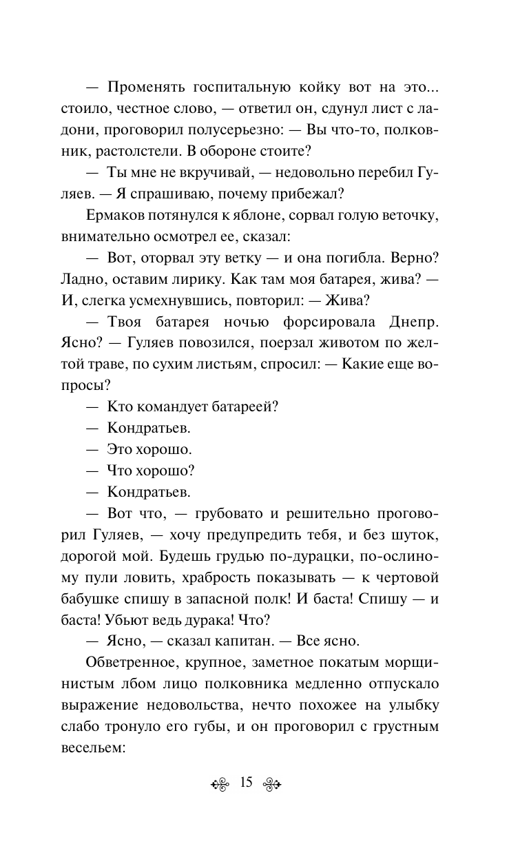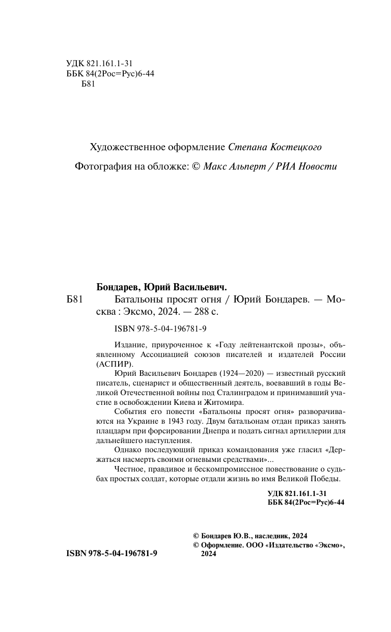 Издание, приуроченное к "Году лейтенантской прозы", объявленному Ассоциацией союзов писателей и издателей России (АСПИР). В 2024 году сразу несколько писателей и поэтов-фронтовиков отмечают 100-летний юбилей. Среди них Юрий Бондарев, Борис Васильев, Василь Быков, Владимир Богомолов, Виктор Астафьев, Булат Окуджава, Юлия Друнина, Николай Старшинов. Юрий Васильевич Бондарев (1924-2020) - известный русский писатель, сценарист и общественный деятель, воевавший в годы Великой Отечественной войны под Сталинградом и принимавший участие в освобождении Киева и Житомира. События его повести "Батальоны просят огня" разворачиваются на Украине в 1943 году. Двум батальонам отдан приказ занять плацдарм при форсировании Днепра и подать сигнал артиллерии для дальнейшего наступления. Однако последующий приказ командования уже гласил "держаться насмерть своими огневыми средствами". Честное, правдивое и бескомпромиссное повествование о судьбах простых солдат, которые отдали жизнь во имя Великой Победы.