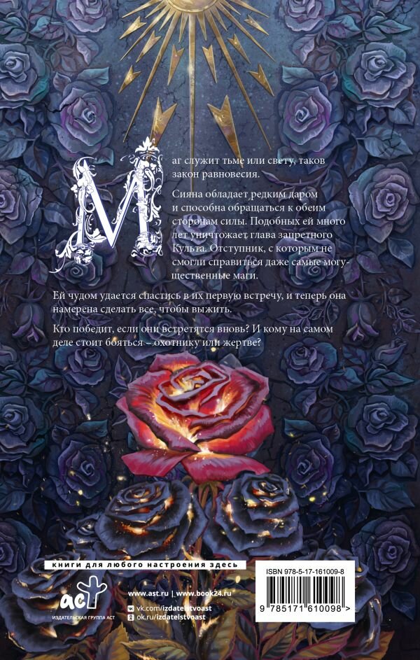 Маг служит тьме или свету, таков закон равновесия. Сияна обладает редким даром и способна обращаться к обеим сторонам силы. Подобных ей много лет уничтожает глава запретного Культа. Отступник, с которым не смогли справиться даже самые могущественные маги. Ей чудом удается спастись в их первую встречу, и теперь она намерена сделать все, чтобы выжить. Кто победит, если они встретятся вновь? И кому на самом деле стоит бояться – охотнику или жертве?