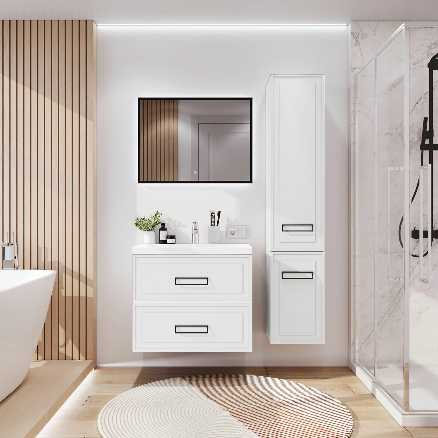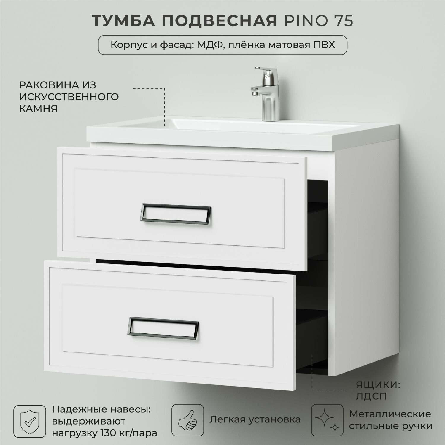 Модная и актуальная, строгая и элегантная коллекция в стиле нео-классика украсит современную ванную комнату. Строгую фрезеровку фасадов подчеркивает современная, дерзкая ручка. Подвесная тумба с раковиной украсит ванную комнату в современном стиле. Тумба для ванной выполнена из влагозащитного МДФ в пленке ПВХ и будет радовать Вас долгие годы. Качественная фурнитура с доводчиками обеспечивает легкое открывание и закрывание ящиков и дверок. Благодаря подвесному типу мебели легко поддерживать чистоту в ванной комнате.