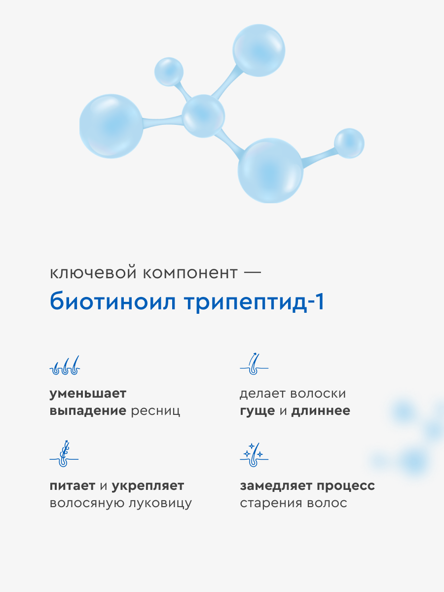 Biotinoyl Tripeptide-1 — ключевой уходовый компонент, способен уменьшить выпадение и сделать ресницы гуще и длиннее, питает и укрепляет волосяную луковицу, замедляет процесс старения волос.