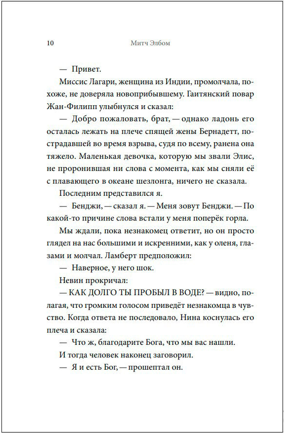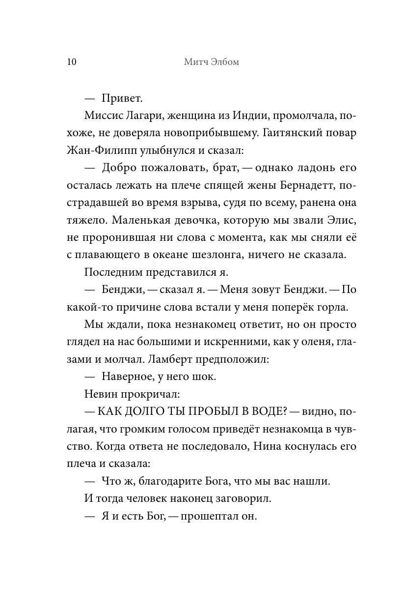 С потерпевшей крушение яхты спасаются только десять человек и оказываются в шлюпке одни посреди бескрайнего океана. Одна из богатейших женщин мира, повар, стюард, владелец яхты объединены общей бедой. Надежда на помощь тает с каждым днем. Но внезапно в шлюпке появляется таинственный гость, который уверяет, что может спасти всех. Кто он на самом деле? Стоит ли верить в чудо в такой безвыходной ситуации? Сможет ли кто-то из пассажиров достичь суши? И кто же виноват в этом чудовищном кораблекрушении? Роман Митча Элбома о силе веры и надежде будет держать вас в напряжении до последней строчки. "Митч Элбом - один из самых популярных американских писателей, чьи книги возглавляют списки самых продаваемых романов в США. "Незнакомец в спасательной шлюпке" - книга о людях, дошедших до отчаяния, находящихся в поисках Бога. Но что, если Господь решит ответить на их молитвы? Как они на это отреагируют? Множество американских читателей пишут, что "Незнакомец в спасательной шлюпке" не отпускает их и спустя несколько недель после прочтения. Проверьте, может быть, с вами будет так же? " - Денис Корсаков, обозреватель Афиши Комсомольской правды
