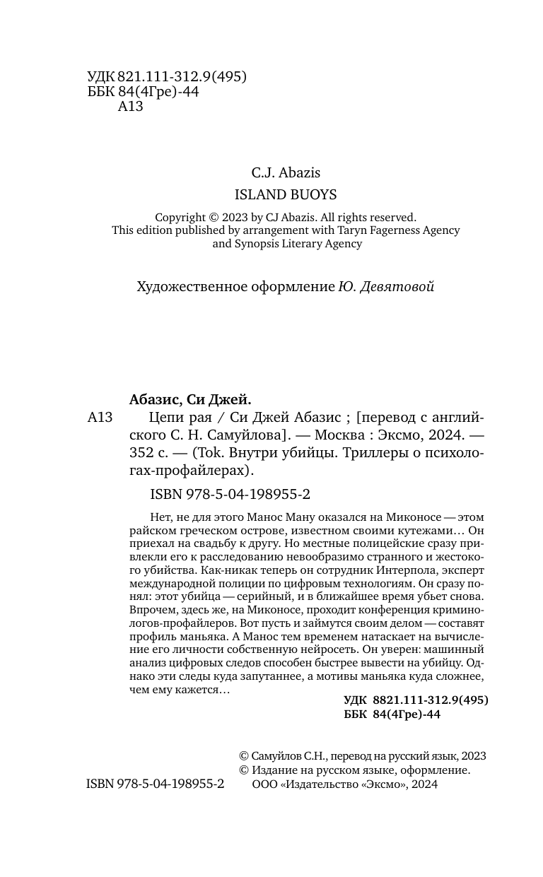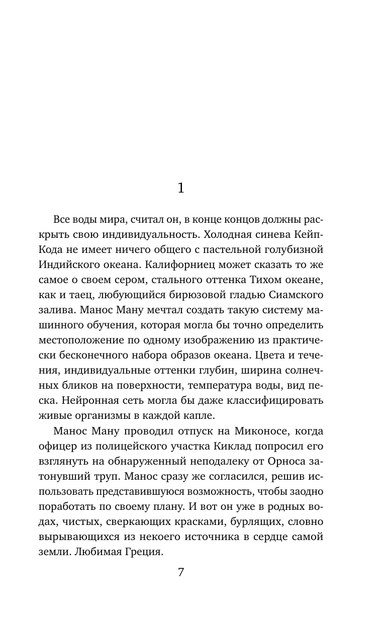 Нет, не для этого Манос Ману оказался на Миконосе — этом райском греческом острове, известном своими кутежами… Он приехал на свадьбу к другу. Но местные полицейские сразу привлекли его к расследованию невообразимо странного и жестокого убийства. Как-никак теперь он сотрудник Интерпола, эксперт международной полиции по цифровым технологиям. Он сразу понял: этот убийца — серийный, и в ближайшее время убьет снова. Впрочем, здесь же, на Миконосе, проходит конференция криминологов-профайлеров. Вот пусть и займутся своим делом — составят профиль маньяка. А Манос тем временем натаскает на вычисление его личности собственную нейросеть. Он уверен — машинный анализ цифровых следов способен быстрее вывести на убийцу. Однако эти следы куда запутаннее, а мотивы маньяка куда сложнее, чем ему кажется…