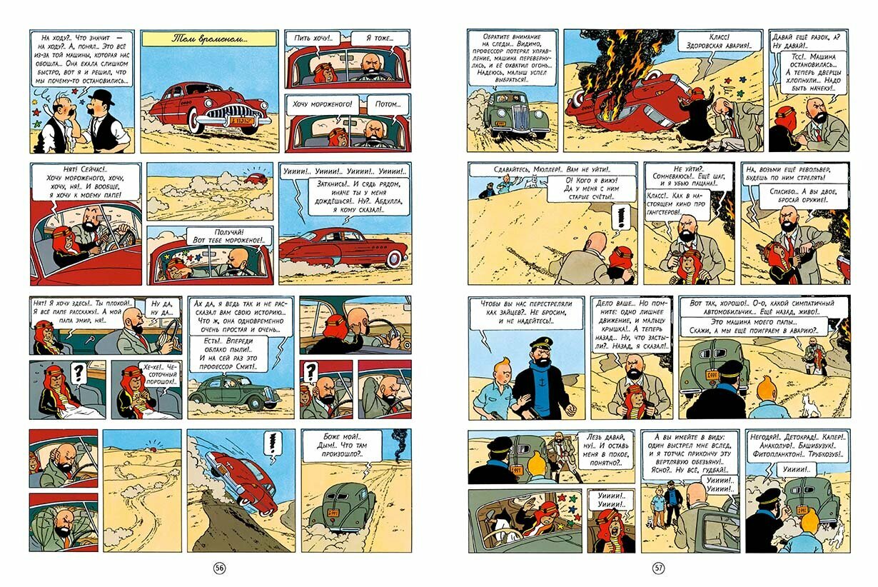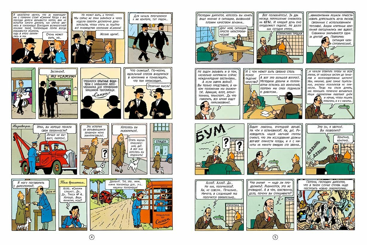 Автомобильные моторы поразила странная эпидемия: они вдруг начали взрываться без каких-либо видимых причин. Газеты наперебой кричат о катастрофе: акции нефтяных компаний стремительно падают, скважины закрываются, авиаперевозки сворачиваются из-за плохого качества топлива: Специалисты сутками не выходят из лабораторий, однако найти объяснение загадочному феномену не могут, ведь методы добычи и переработки нефти остались прежними; пробы горючего тоже ничего не дали: Так, может, это чей-то злой умысел? Если да, то кто же за ним стоит? Ответить на все вопросы и раскрыть тайну взрывающегося бензина берется Тинтин. Для этого он нанимается радистом на танкер "Спидол стар", отплывающий в Хемедскую Аравию - страну черного золота.