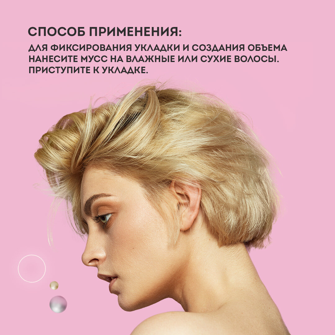 Мусс обеспечивает естественную и надёжную фиксацию любой укладки. Придаёт волосам заметный объём у корней, не утяжеляя их. Входящие в состав ингредиенты защищают волосы от потери влаги при воздействии высоких температур и обеспечивают их блеск и здоровый вид. Удобный дозатор и невесомая текстура мусса позволяют равномерно распределять средство на волосы.