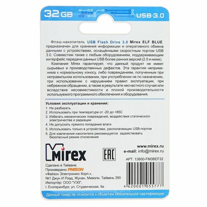 Флешка Mirex ELF USB 3.0 32 ГБ 1 шт. синий ELF 32Gb USB 3.0 Blue