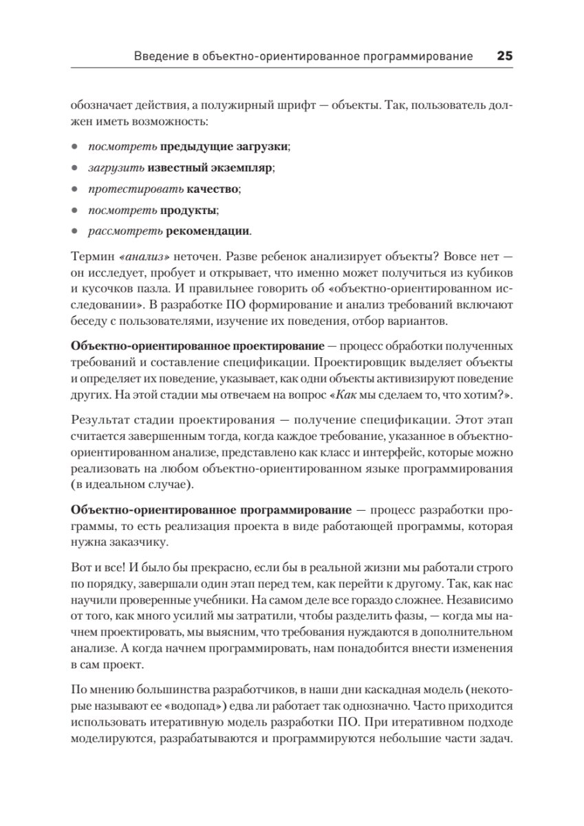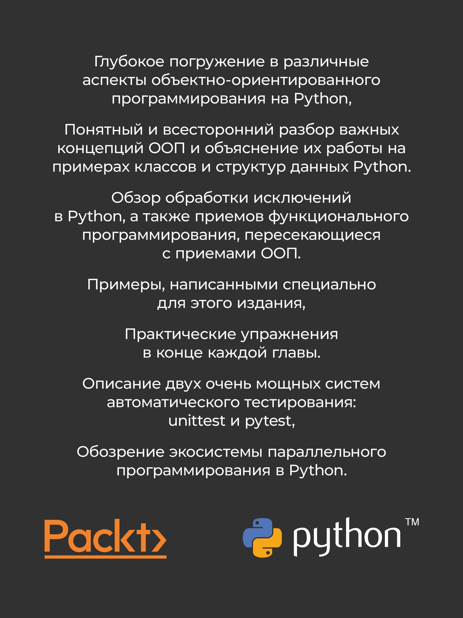 Глубоко погрузитесь в различные аспекты объектно-ориентированного программирования на Python, паттерны проектирования, приемы манипулирования данными и вопросы тестирования сложных объектно-ориентированных систем. Обсуждение всех понятий подкрепляется примерами, написанными специально для этого издания, и практическими упражнениями в конце каждой главы. Код всех примеров совместим с синтаксисом Python 3.9+ и дополнен аннотациями типов для упрощения изучения.Стивен и Дасти предлагают вашему вниманию понятный и всесторонний обзор важных концепций ООП, таких как наследование, композиция и полиморфизм, и объясняют их работу на примерах классов и структур данных Python, что заметно облегчает проектирование. В тексте широко используются UML-диаграммы классов, чтобы было проще понять взаимоотношения между классами. Помимо ООП, в книге подробно рассматривается обработка исключений в Python, а также приемы функционального программирования, пересекающиеся с приемами ООП. В издании представлены не одна, а две очень мощные системы автоматического тестирования: unittest и pytest, а в последней главе детально обсуждается экосистема параллельного программирования в Python.Получите полное представление о том, как применять принципы объектно-ориентированного программирования с использованием синтаксиса Python, и научитесь создавать надежные и устойчивые программы.