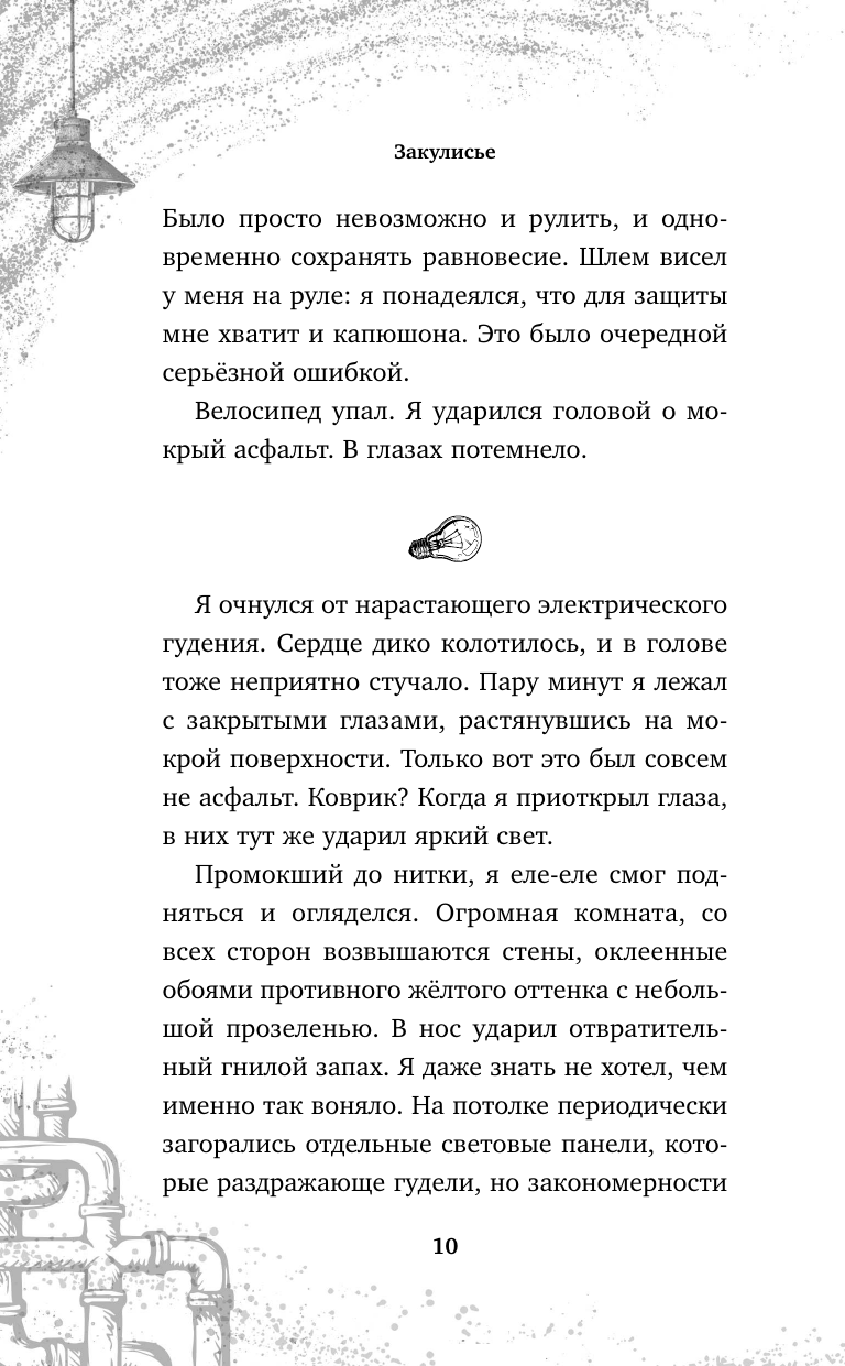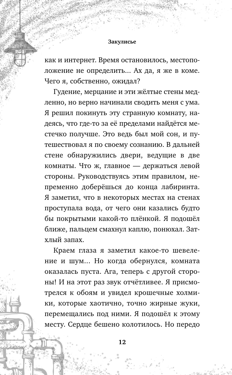 Бесконечный лабиринт с желтыми комнатами. Мерцающие лампы и чьи-то взгляды из темных углов. Еще несколько минут назад Марк ехал на велосипеде по мокрым улицам родного городка. А теперь оказался в незнакомом жутком месте. И это место - параллельное измерение Закулисье. Сюда не попадают просто так. Многие бродят по уровням годы, сражаясь с чудовищами и выбираясь из ловушек. И никогда не возвращаются обратно в Реальность. Но Марк намерен выяснить, зачем его забросило в жуткое измерение. И отыскать дорогу обратно.