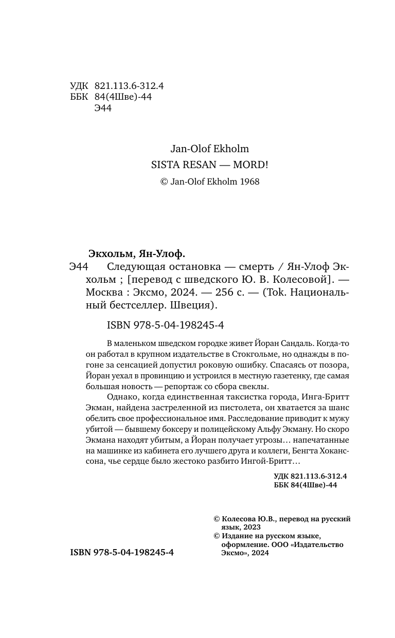 Следующая остановка - смерть (Ян-Олаф Экхольм); Эксмо, Inspiria, Редакция 1, 2024