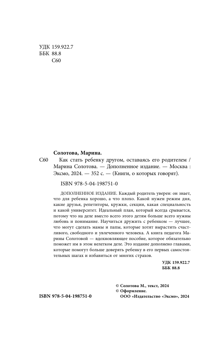 Как стать ребенку другом оставаясь его родителем (дополненное издание) (Марина Солотова); Эксмо, БОМБОРА, 2024