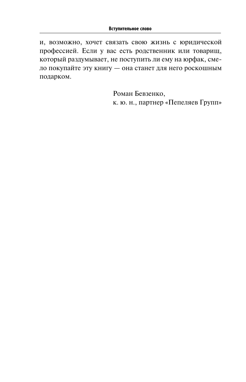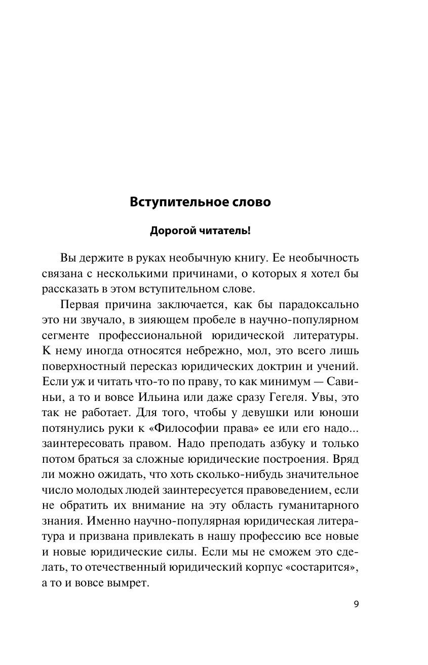 «Предлагаемая вашему вниманию работа – это в самом лучшем значении научно-популярная книга. В ней вы найдете все, что надо знать человеку, желающему изучать право, о юриспруденции как науке, о праве как социальном феномене, об отраслях права, о нормативных актах и прочем» – Артем Бевзенко, кандидат юридических наук, практикующий юрист