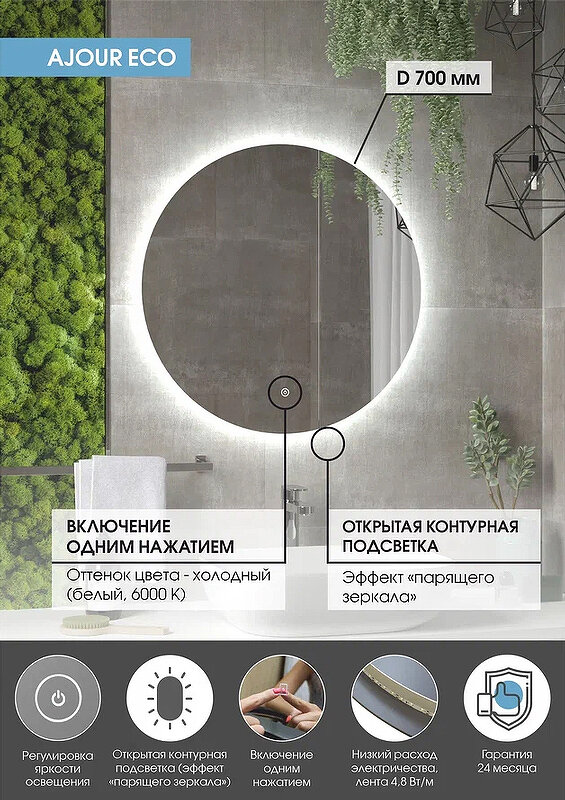 Зеркало Ajour ECOс холодной LED-подсветкой изготовлено из влагостойкого зеркального полотна толщиной 4 мм от ведущего европейского производителя зеркал AGC. Модель отличается классическим дизайном. Используется для ванной комнаты. Но так же его можно использовать как и интерьерное зеркало в спальную или гостиную. Так же данная модель оснащена функцией регулировки яркости подсветки (диммированием). Край полотна обработан еврокромкой, что обеспечит безопасный контакт с краями изделия. Данная модель подключается к сети 220В напрямую или через кабель с вилкой, который идёт в комплекте с зеркалом. Зеркало для ванной комнаты обеспеченно мягкой подсветкой, создающей эффект парения. Температура свечения подсветки зеркала - холодная 6000К. Яркость подсветки регулируется с помощью сенсорной кнопки, удобно расположенной в нижней части зеркала. Предусмотрен настенный крепеж для установки зеркала на стену. Изделие прошло обязательную сертификацию и может использоваться в помещениях с повышенной влажностью воздуха. Гарантия - 2 года.