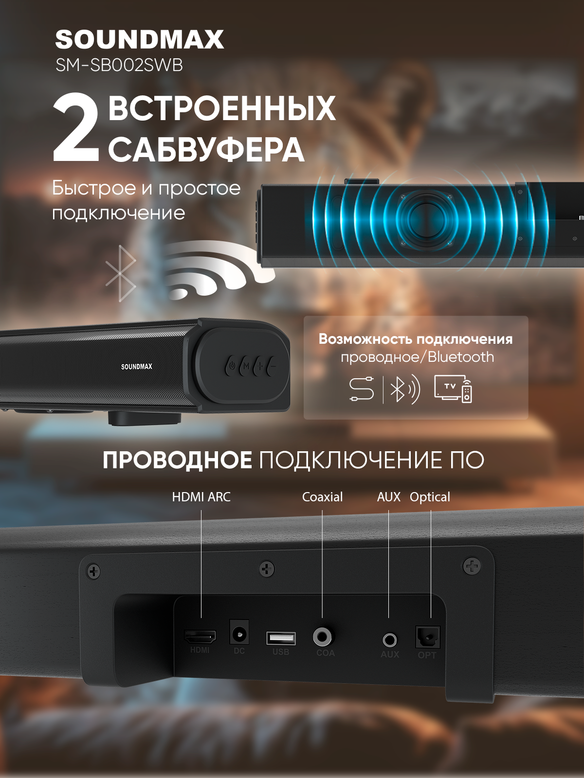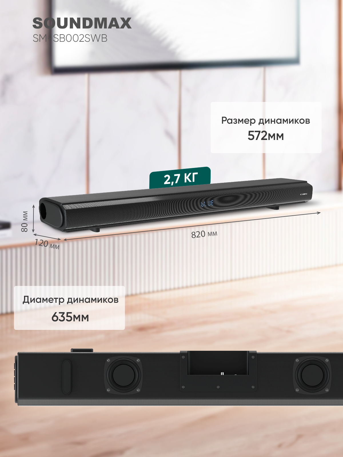Саундбар SM-SB002SWB от бренда SOUNDMAX со встроенным сабвуфером - идеальное решение для вашей аудио системы! Суммарная мощность 160 Вт позволяет вам насладиться качественным звуком со всеми нюансами и глубиной.