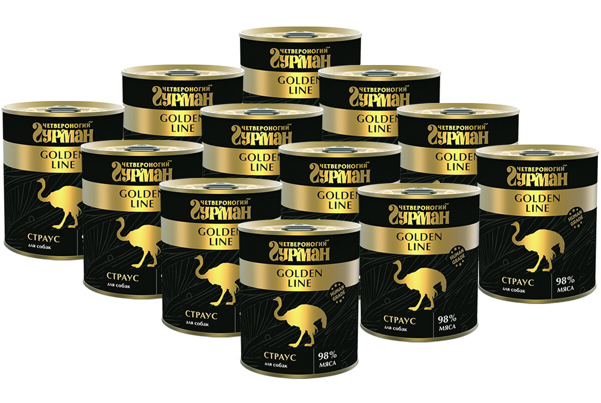 Четвероногий гурман GOLDEN LINE для собак – это влажный корм суперпремиум класса, приготовленный из одного вида мяса качества Human grade.Ключевые особенности:Сырье высшего качества.Исключительно натуральные ингредиенты.Сырье, пригодное в пищу человеку.Настоящее мясо в банке.Корм полностью натуральный – в его составе нет искусственных красителей, ароматизаторов, усилителей вкуса и ГМО. Открыв баночку, вы увидите крупно нарезанное сочное филе.GOLDEN LINE – это 98% настоящего мяса в натуральном ароматном желе.Подходит для собак всех пород, а также для питомцев, которым показана строгая или монобелковая диета.Состав: мясо страуса, вода питьевая, желирующая добавка.