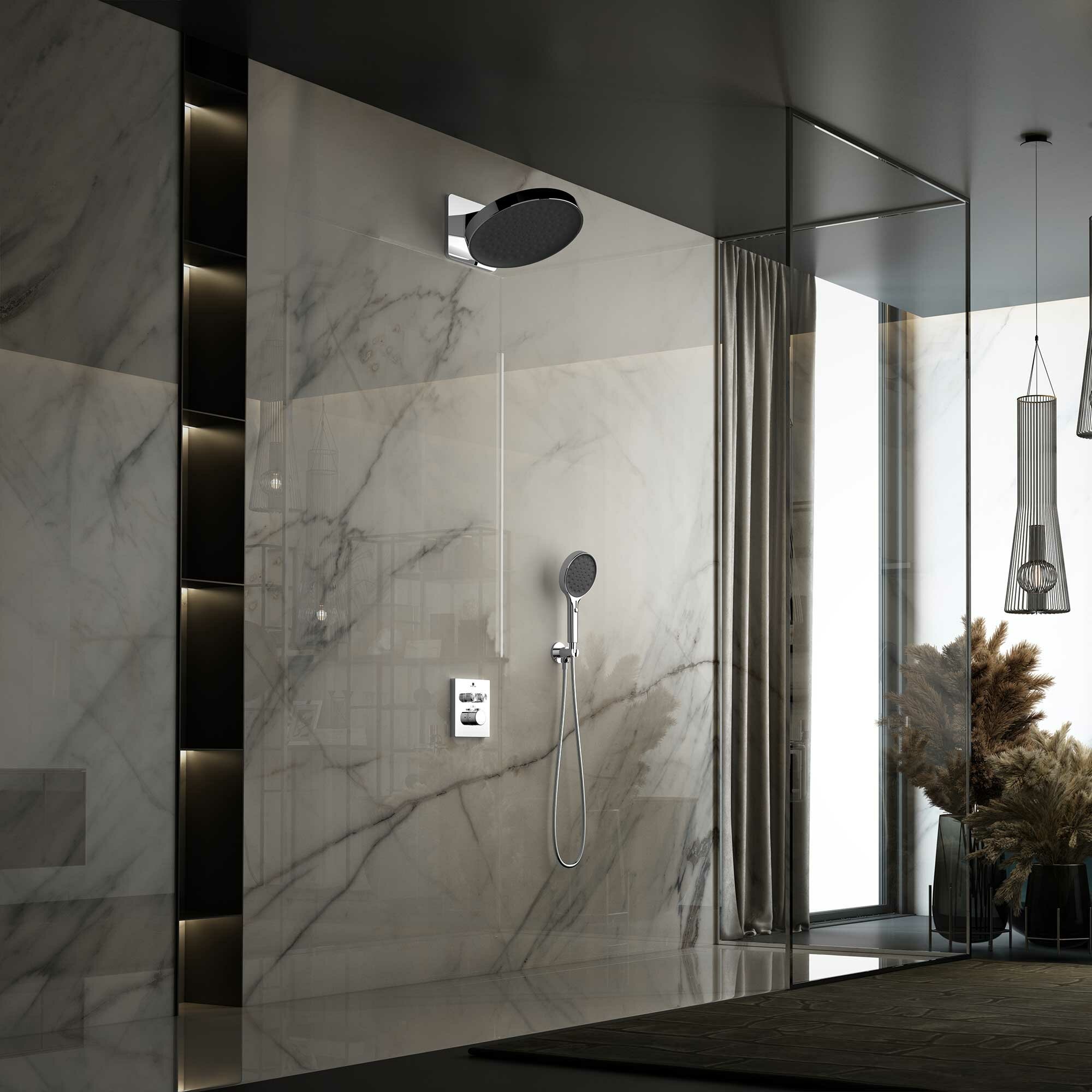 Душевой комплект Inspire встраиваемый, термостатический, двухрежимный, хром. Верхний душ ABS/латунь (режим работы Rain). 4-х режимный ручной душ из ABS cо слайдером (Rain - Pulsating Rain - SPA - Mist). Встраиваемый смеситель c 2-х режимной регулировкой напора воды. Держатель ручного душа из латуни. Размер верхнего душа 300мм. Шланг для душа из ПВХ. Гарантия: 5 лет смеситель, 1 год комплектующие