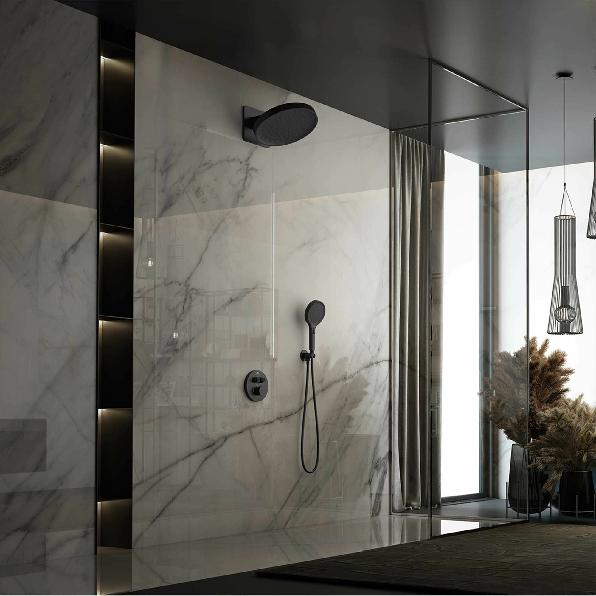 Душевой комплект Inspire встраиваемый, термостатический, двухрежимный, черный. Верхний душ ABS/латунь (режим работы Rain). 4-х режимный ручной душ из ABS cо слайдером (Rain - Pulsating Rain - SPA - Mist). Встраиваемый смеситель c 2-х режимной регулировкой напора воды. Держатель ручного душа из латуни. Размер верхнего душа 300мм. Шланг для душа из ПВХ . Гарантия: 5 лет смеситель, 1 год комплектующие