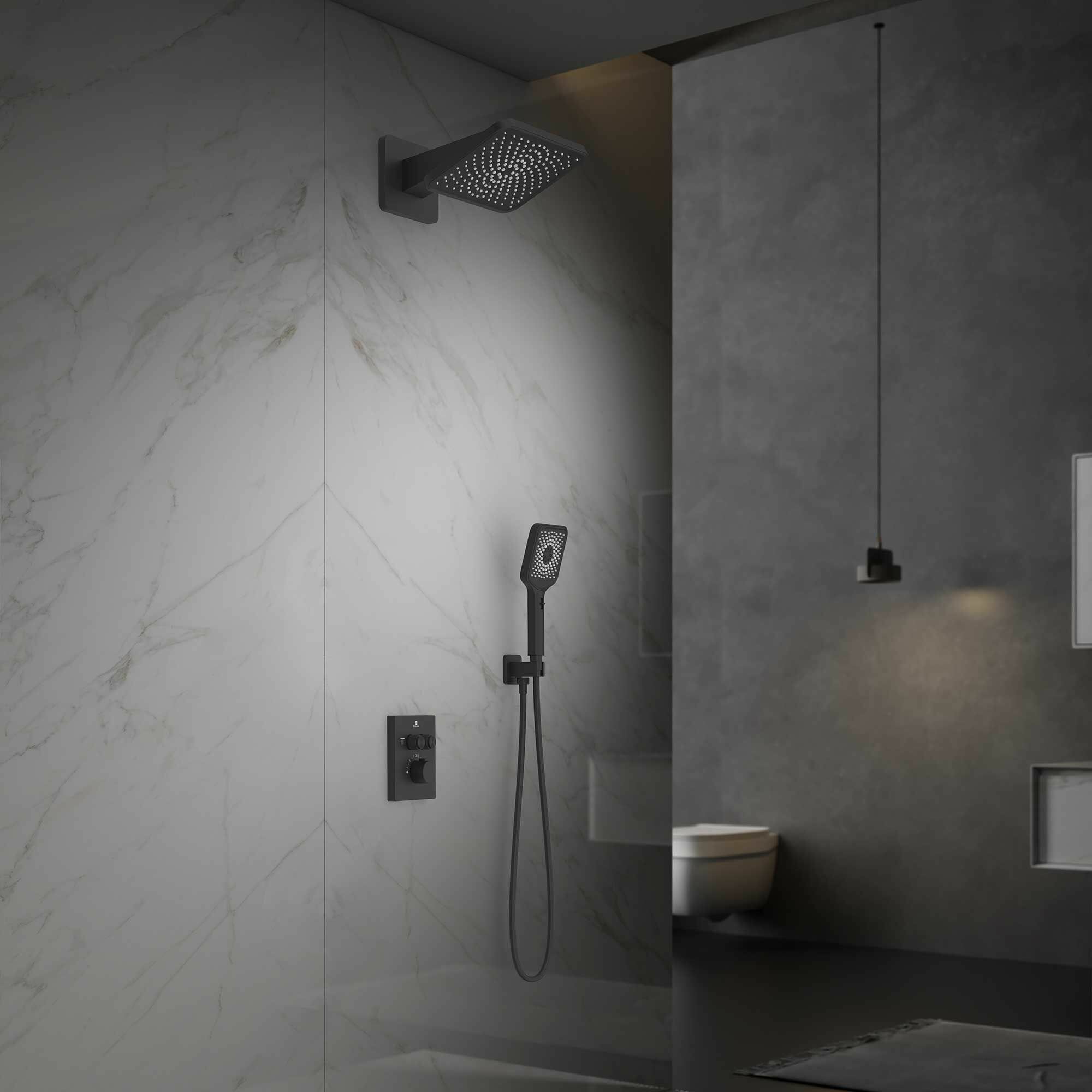 Душевой комплект Inspire встраиваемый, термостатический, двухрежимный, черный. Верхний душ ABS/латунь (режим работы Rain). 4-х режимный ручной душ из ABS cо слайдером (Rain - Pulsating Rain - SPA - Mist). Встраиваемый смеситель c 2-х режимной регулировкой напора воды. Держатель ручного душа из латуни. Размер верхнего душа 320x200мм. Шланг для душа из ПВХ . Гарантия: 5 лет смеситель, 1 год комплектующие