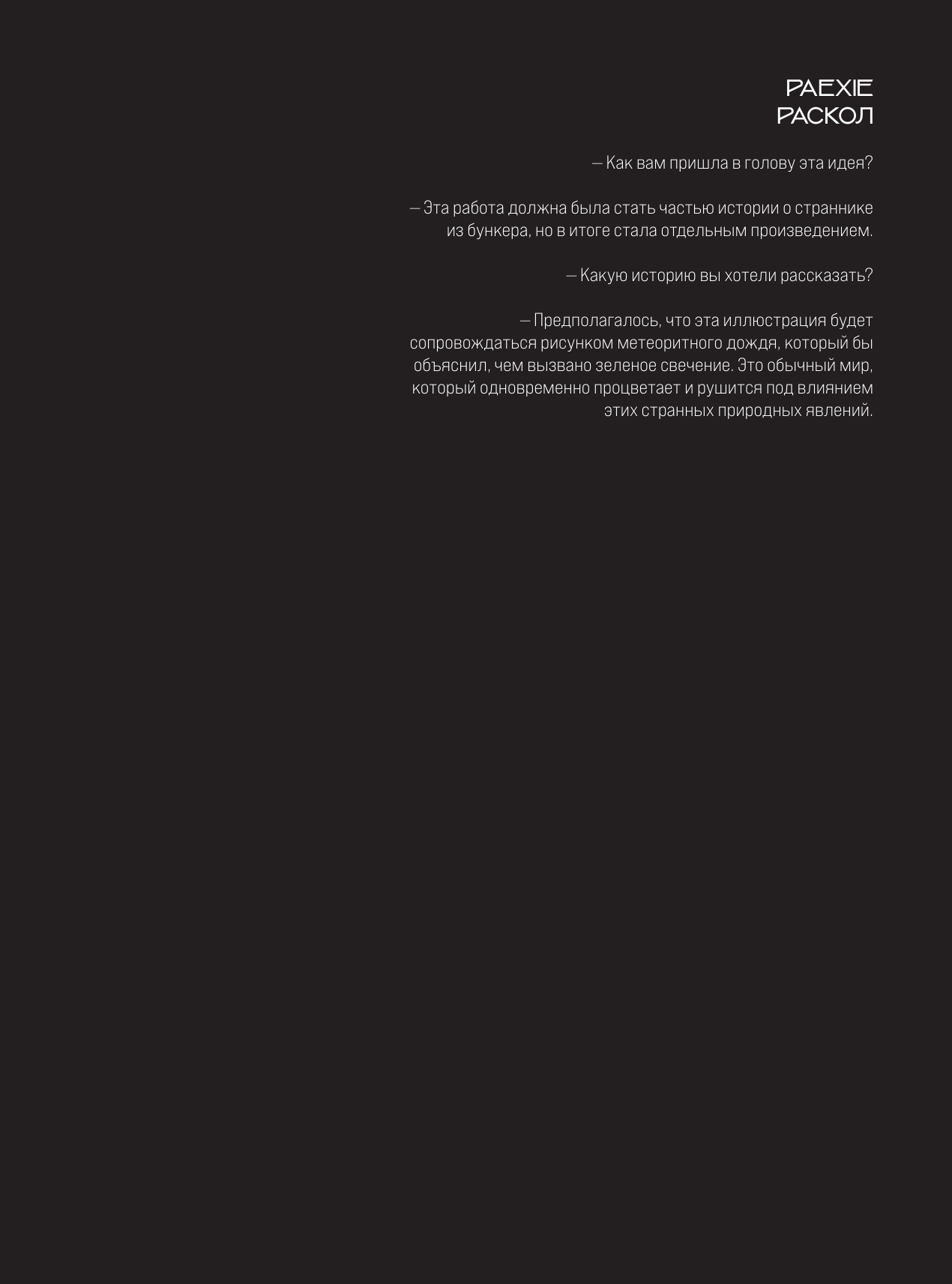 Перед вами - мрачные мечты об Апокалипсисе, пропитанные невероятной любовью к жизни и восхищением перед природой. Под одной обложкой собрана коллекция работ шестнадцати художников со всего мира. В своих работах они размышляют о жизни после Судного дня, рассказывают о вдохновивших их идеях и делятся историями, которые стоят за дивным новым миром. На страницах артбука вы найдете более 70 иллюстраций, где раскинулись пустынные пейзажи будущего мира, опустошенного бедствиями Апокалипсиса и в то же время воспевается способность самой природы к обновлению.