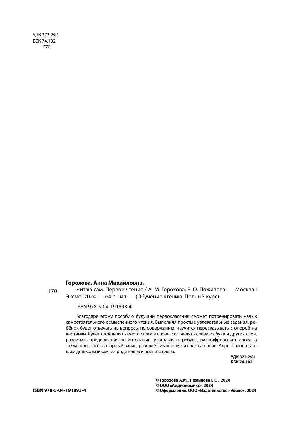 Книга: Читаю сам. Первое чтение (Горохова Анна Михайловна, Пожилова Елена Олеговна); ООО "Издательство "Эксмо", 2024